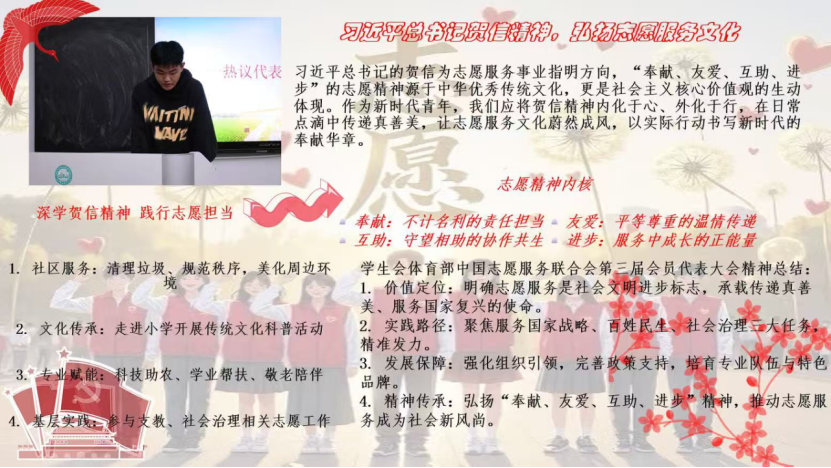 集体学习习近平总书记贺信精神、研讨弘扬志愿服务文化后,现场交流氛围热烈浓厚,五名同学结合自身参与志愿活动的经历与专业方向分享心得。许多同学同学表示,要以专业方法赋能志愿项目,精准对接服务对象需求;志愿服务队的同学提及,会牵头带动志愿服务,让 “小服务” 对接 “大需求”。同学们提出要将贺信精神融入志愿实践,以实际行动传递温暖、弘扬新风,为营造崇德向善的校园氛围贡献青春力量。