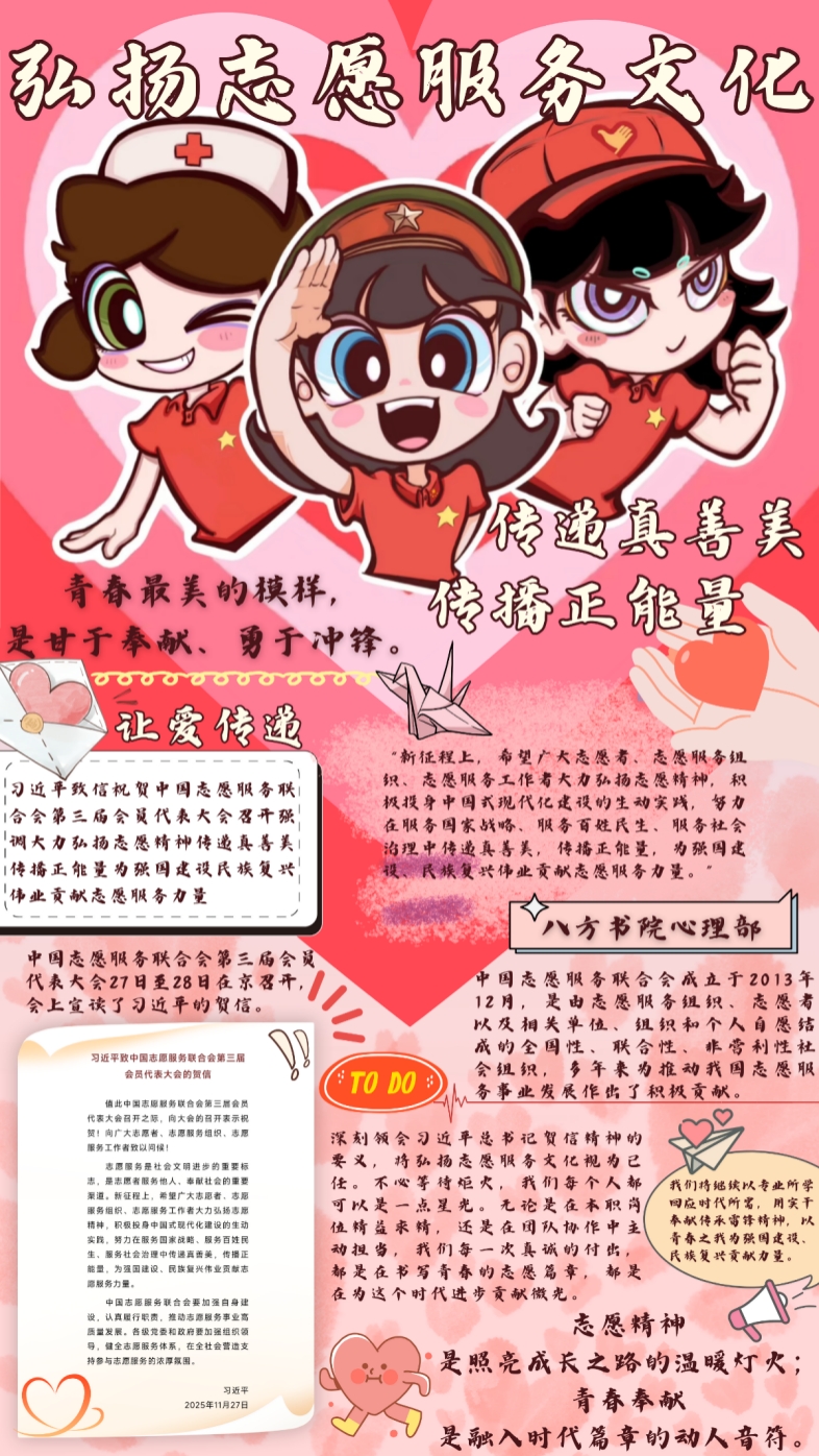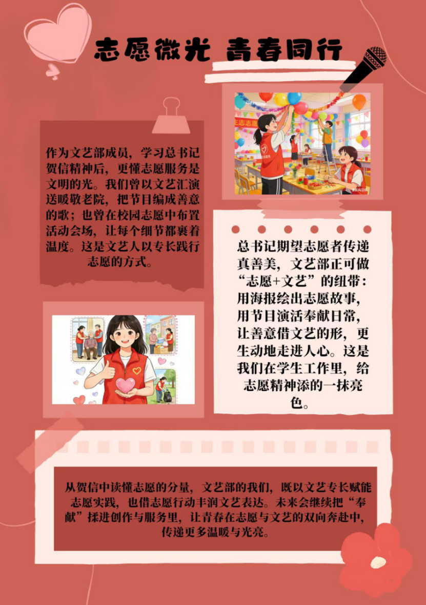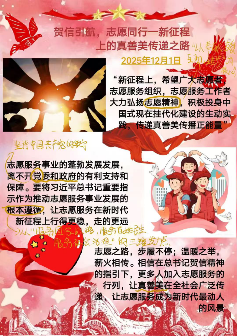 学习结束后,大家围绕 “习近平总书记贺信精神,弘扬志愿服务文化” 主题展开热烈交流,从贺信精神的核心内涵、志愿服务文化的时代价值到实践落地的具体路径,纷纷分享理解与思路,还结合自身志愿服务经历讨论如何让精神内涵与服务实践更紧密融合。大家最终梳理出五份学习实践清单。这些清单既提炼了贺信精神的关键要点,也融入了各自对志愿服务的思考与规划,不仅展现了深刻的学习领悟,更通过清单这一清晰形式,让精神指引转化为可落地的服务方向,让志愿服务更具时代温度与实际效能。