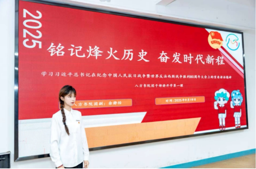八方书院团委学生副书记余静怡从“铭记烽火历史,奋发时代新程”出发,结合自身学习体会,与青年们共同回顾了中国人民抗日战争的壮烈历程与英雄事迹。她讲到那段烽火岁月虽已远去,但其中蕴含的爱国信念、团结精神与坚韧品格,依然对新时代大学生的成长具有深刻的启示意义。她鼓励大家不仅要了解历史、敬畏历史,更应从中汲取精神养分,树立远大志向以实际行动在大学阶段踏实求学全面发展。