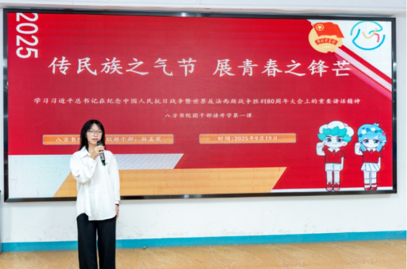 八方书院团委组织部干部林孟霓围绕“传民族之气节,展青年之锋芒”。从抗战历史中中华民族展现出的不屈气节与伟大精神出发,通过真实感人的英雄事迹和历史细节生动解读了以爱国主义、团结奋斗、不畏强暴、勇于牺牲为核心的抗战精神。她强调,这种气节不仅是民族存续的精神根基,更是新时代青年应当传承和弘扬的宝贵品质。