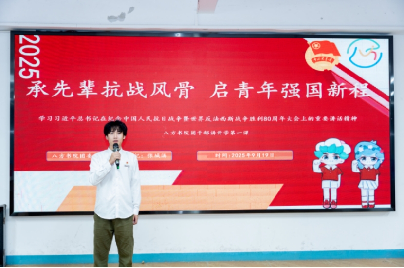 八方书院团委学生副书记张城涵围绕“承先辈抗战风骨 启青年强国新程”,带领同学们重温峥嵘岁月、激发使命担当。他从抗战历史中的青年故事切入,结合图片与事迹,生动讲述了先辈们为民族存亡而战的英勇风骨与坚定信念。他表示,伟大抗战精神不仅是民族记忆的核心,更应成为当代青年砥砺前行、立志报国的力量源泉。