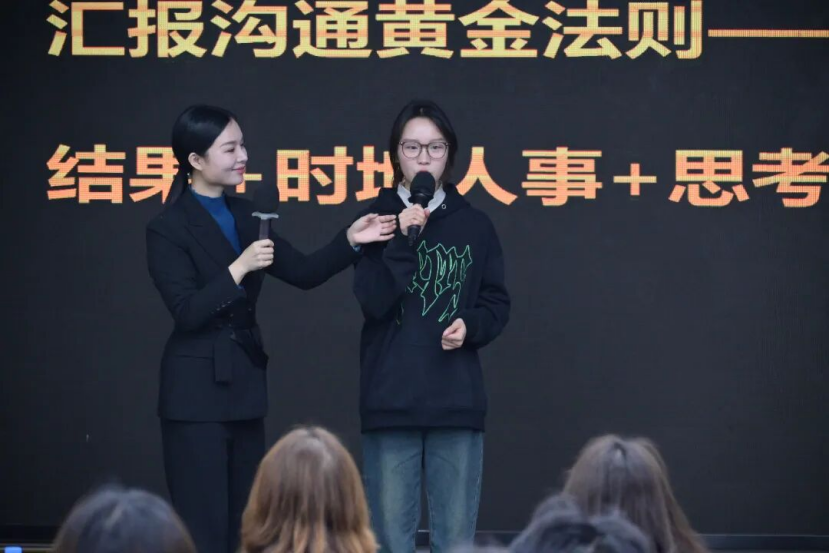 为让同学们更直观地掌握汇报沟通技巧,欧文靖设计互动练习环节,邀请现场同学上台模拟实操。练习聚焦“组织一场班级座谈会”的具体场景,同学们分别扮演“学生筹备负责人”与“指导老师”的角色,沉浸式开展情景演绎。欧文靖在旁实时观察,针对汇报过程中的语言逻辑、肢体表达、时机把控等细节逐一点评指导,现场示范标准的汇报表达方式,同时点明“先讲结果再述过程”“带着解决方案提问题”等关键要点。台下同学们全神贯注,认真观摩记录,收获颇丰。