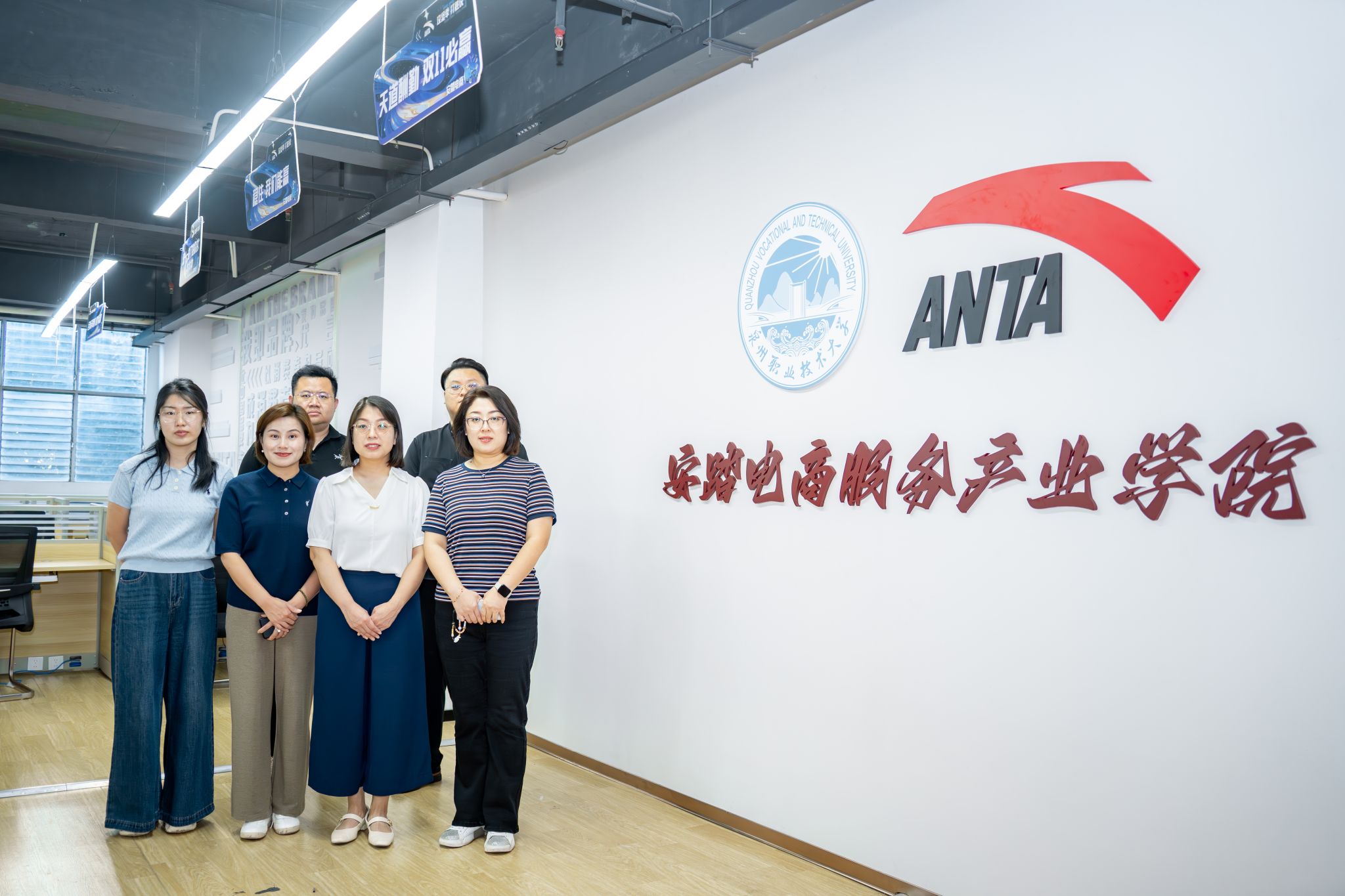 在安踏产业学院新址,商学院实验员郭晓莹向李院长一行介绍了全新规划的实训区,墙上的合作成果展示板清晰呈现了产业学院的人才培养数据与校企合作项目。