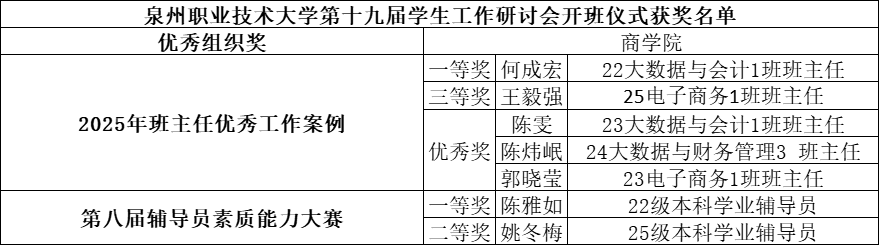 冬日暖阳映校园,硕果飘香励人心。12月24日下午,泉州职业技术大学第十九届学生工作研讨会在A633报告厅隆重举行。本次学生工作研讨会不仅为学校学生工作的深度研讨拉开序幕,更对过去一段时间内在学生工作领域表现突出的优秀集体与个人进行了集中表彰。其中,商学院凭借扎实的工作成效、创新的育人举措,在本次表彰中表现亮眼、获奖斐然,成为现场备受瞩目的焦点。