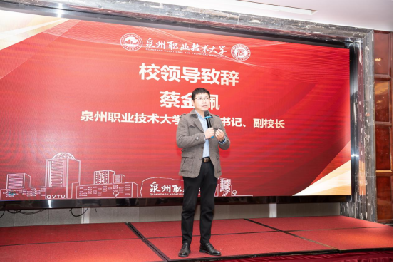 泉州职业技术大学党委副书记、副校长蔡金佩同志带着对商学院的深厚情感发表致辞。作为曾在商学院深耕多年的“家人”,他深情回顾了与商学院共同成长的岁月,高度赞誉商学院始终是团结奋进、温暖有爱的集体 —— 无论是在岗教职工还是毕业校友,都始终心系集体发展,这份凝聚力正是学院前行的核心动力。商学院的高质量发展离不开党建引领,尤其在学校入选全国第二批 “双高计划” 院校、成为全国仅有的两所民办双高本科院校之一的关键节点,党建的定向领航作用愈发重要。学校作为全国双高建设产教融合专项试点院校,备受教育部关注,这既是荣誉更是重任。他寄语全体教职工,要以党建为魂,传承前辈奉献精神,新老携手融入双高建设浪潮,在集体发展中实现个人成长,让商学院在党建引领下持续焕发活力,在职业教育高质量发展的道路上勇毅前行,为学校党建与事业发展同频共振贡献商科力量。