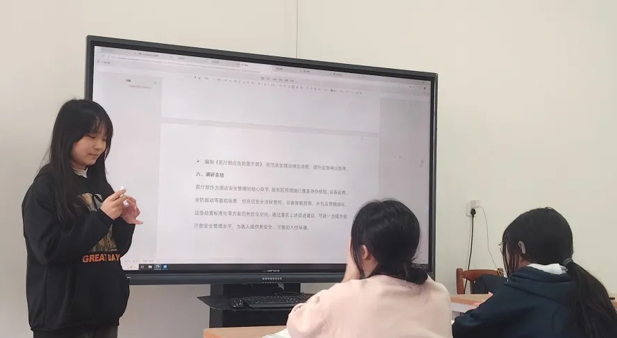 实地参观结束后,同学们结合实践见闻与学习思考,分组完成酒店安全管理调研报告,并在课堂上开展专题学习汇报。通过总结、分享、交流与点评,大家进一步梳理了酒店全流程安全管理体系,强化了安全防范意识与岗位实操能力。