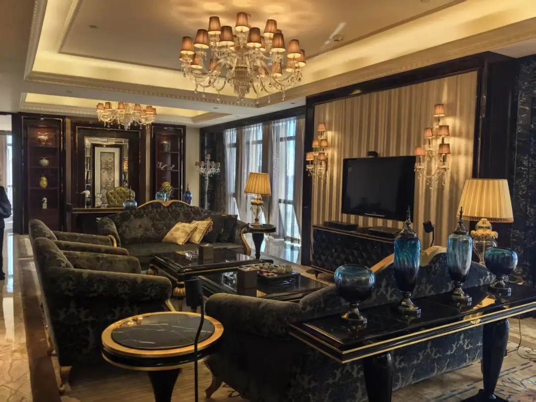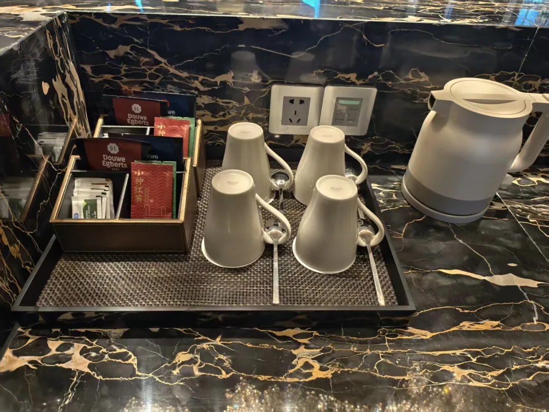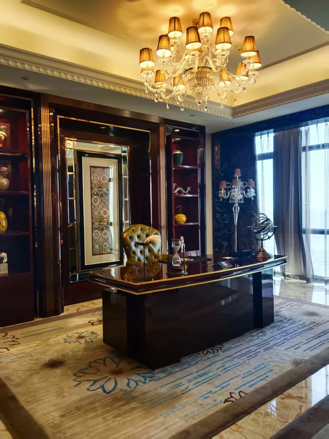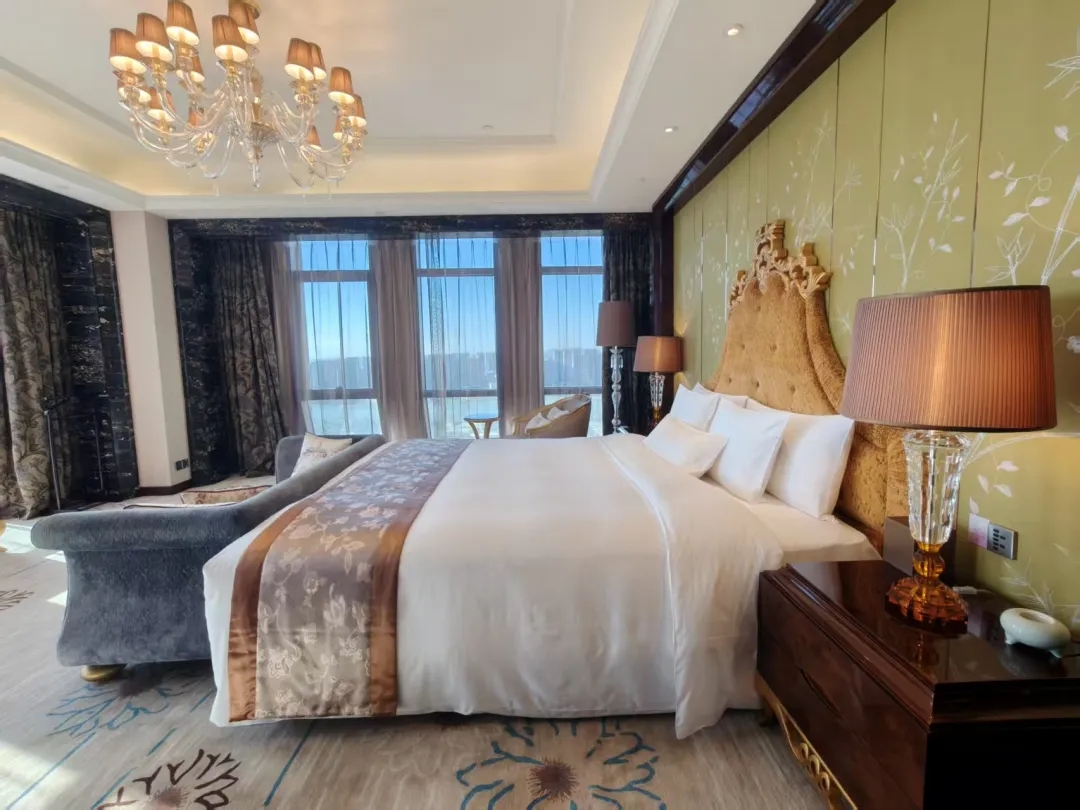 氛围瞬间治愈所有疲惫!从柔软亲肤的床品到摆放整齐的洗漱用品,从一尘不染的桌面到恰到好处的灯光布置,每一处细节都彰显着“品质服务”的标准。由人力资源部主管Lemon带领我们一一参观了总统套房的设施与布局,其中宽敞的客厅与奢华的卧室让我们印象深刻,客厅为满足个性化需求配备了小厨房与咖啡机,卧室中还备有冰箱免费供客人使用。