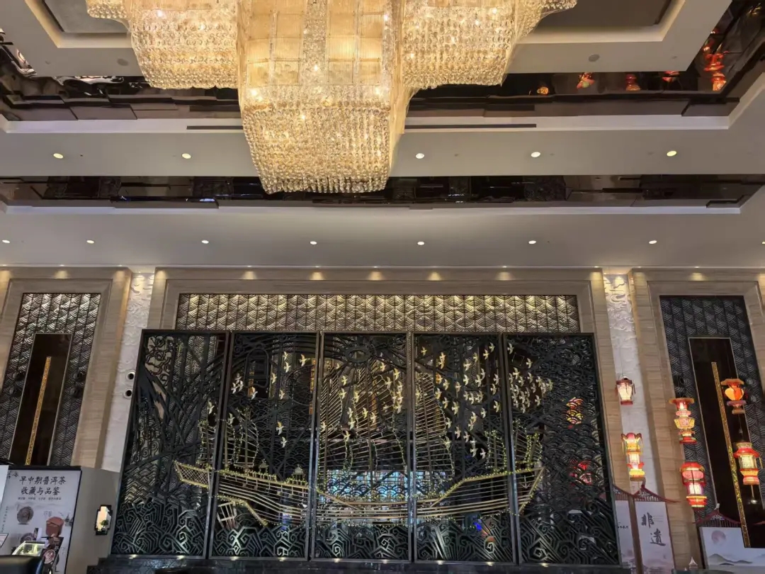 一踏入酒店大堂,典雅大气的设计瞬间让人眼前一亮!暖调灯光搭配质感石材,融合闽南文化元素的装饰细节暗藏巧思,既显高端质感又不失地域风情。在这里,我们跟着人力资源部主管Robin参观了大厅的构成,映入眼帘的便是一扇重达2吨的巨大的屏风,其中海丝帆船文化格外突出,屏风上方则是由数个水晶制成的水晶吊灯,一片片水晶灯形似船帆,充满气质与豪华感。