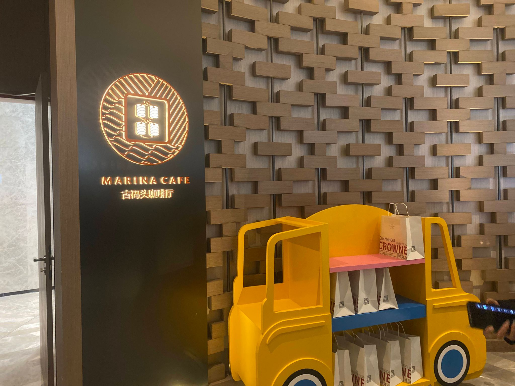 大堂中央,一盏如海浪般起伏的吊灯格外引人注目,灯光流转间,地面洒落的光斑宛若璀璨星辰。朱总监介绍,这里被命名为“观星吧”,灵感源自古人航海仰望星空的悠远意境,让人不禁遥想当年商船乘风破浪的壮阔岁月。大堂的休憩座椅同样暗藏巧思,以古代渔笼为原型设计,既坚固实用,又巧妙承载了泉州深厚的海洋文化记忆。往来宾客中不乏外国友人的身影,足以见得这里已然成为中外商贸往来中一处温馨便捷的交流驿站。随后,朱总监带领我们先后探访了全日制餐厅“古码头咖啡厅。