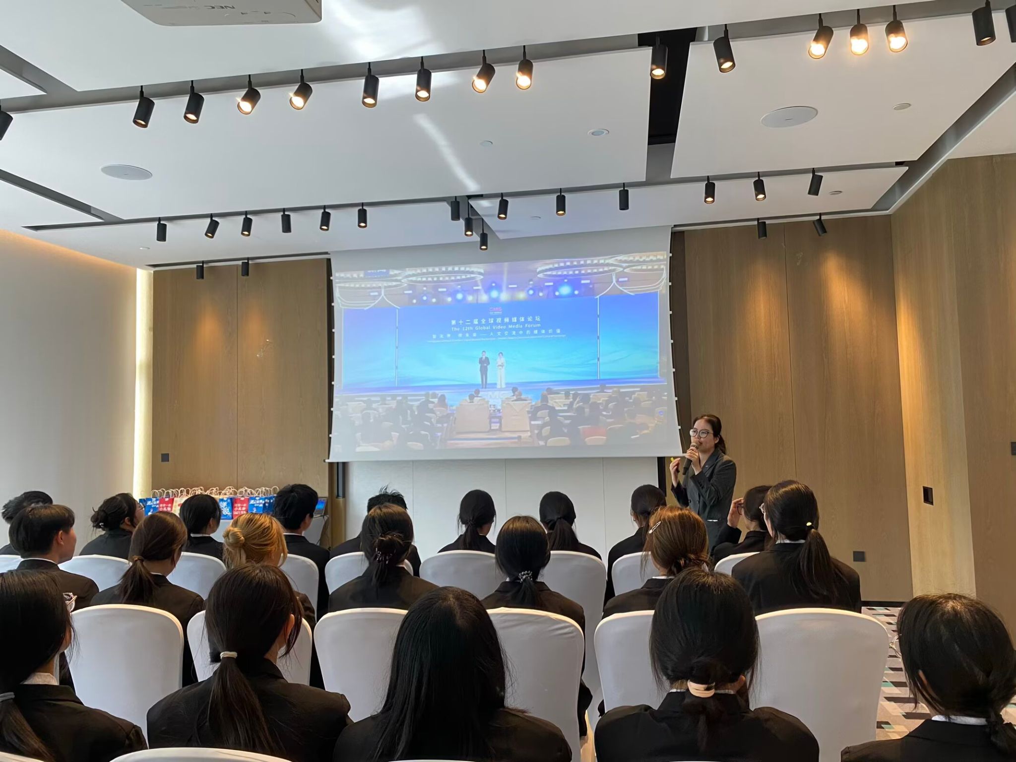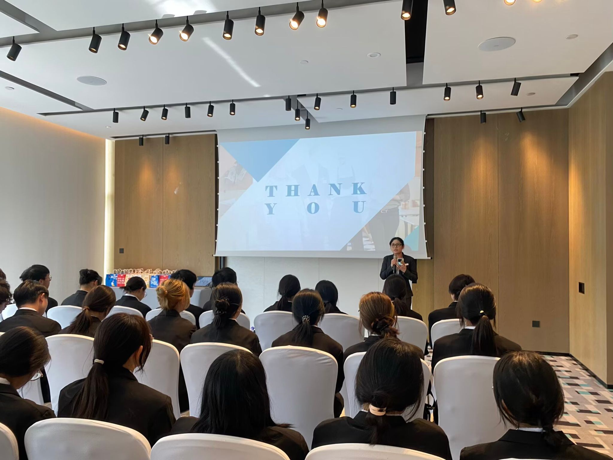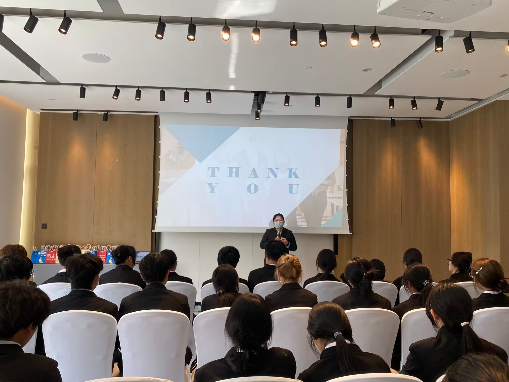 参观的最后一站,我们回到会议室,许笑容经理为我们详细解读了酒店的实习生福利政策与清晰的职业发展通道。不同于以往部分酒店对历史文化的泛泛而谈,此次分享更聚焦于实际成长路径的深度解析,极具参考价值。更令人感动的是,酒店特意邀请了两位同校学姐,她们分别来自前台部与客房部,以亲身职场经历分享了新人入职的注意事项与成长动力,让整场交流在温馨融洽的氛围中圆满落幕。