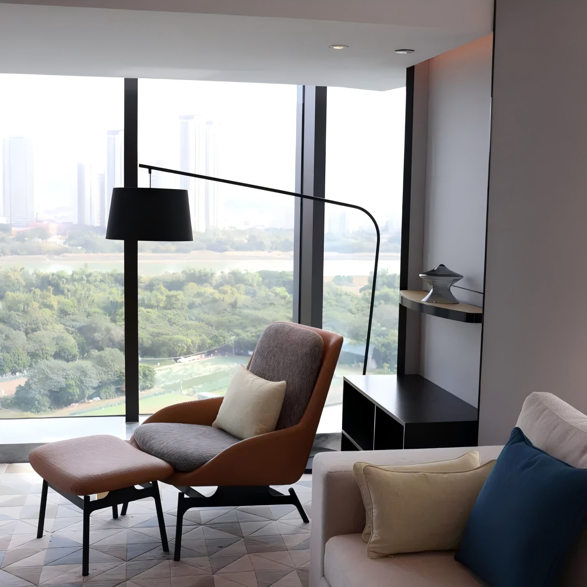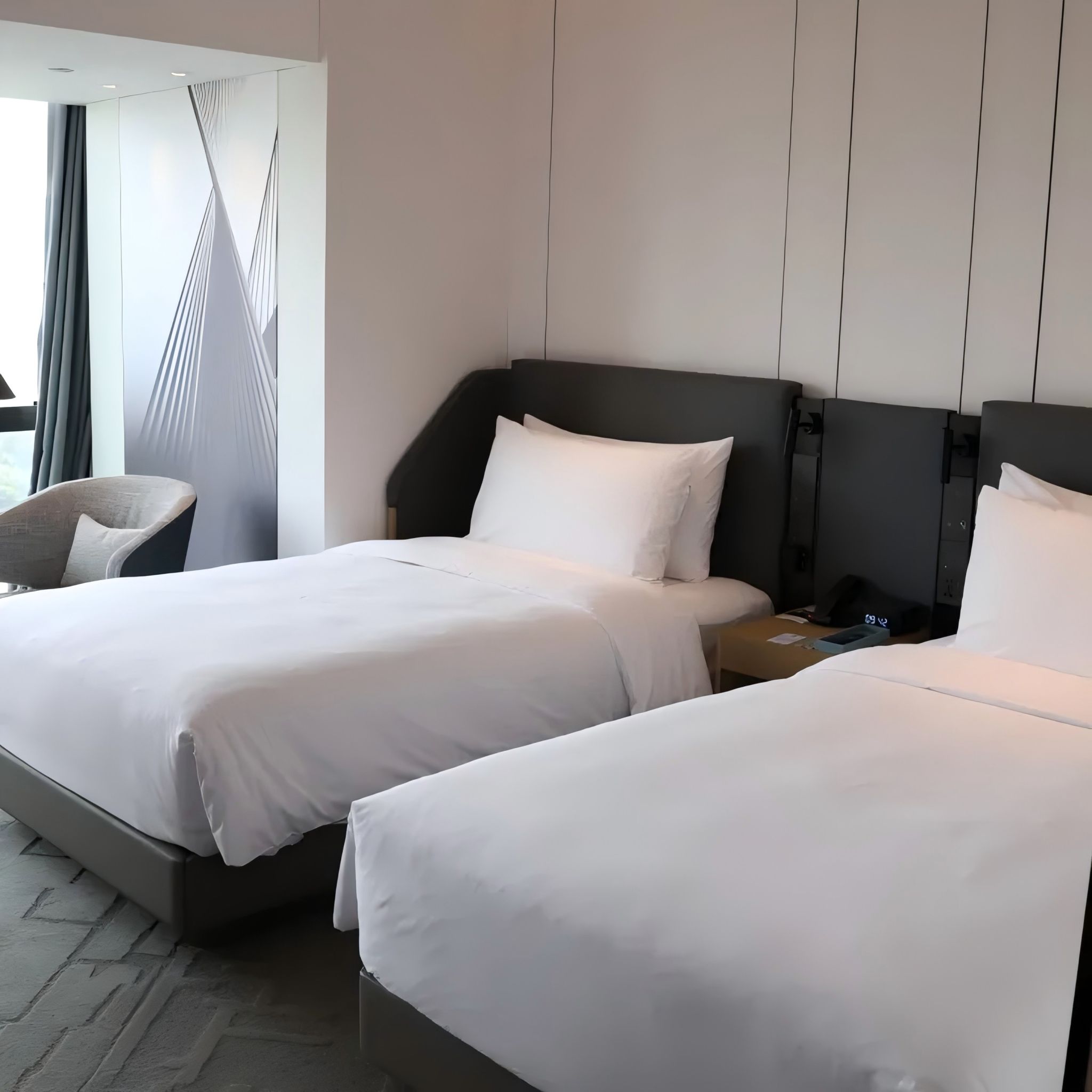 移步至酒店客房,敞亮的自然采光与蓝灰相间的简约设计相得益彰,尽显沉稳大气的商务风范。房间空间开阔通透,更专门设置了小型会议区,为商务客人的团队讨论提供了极大便利,每一处细节都流露着酒店的贴心与周到。