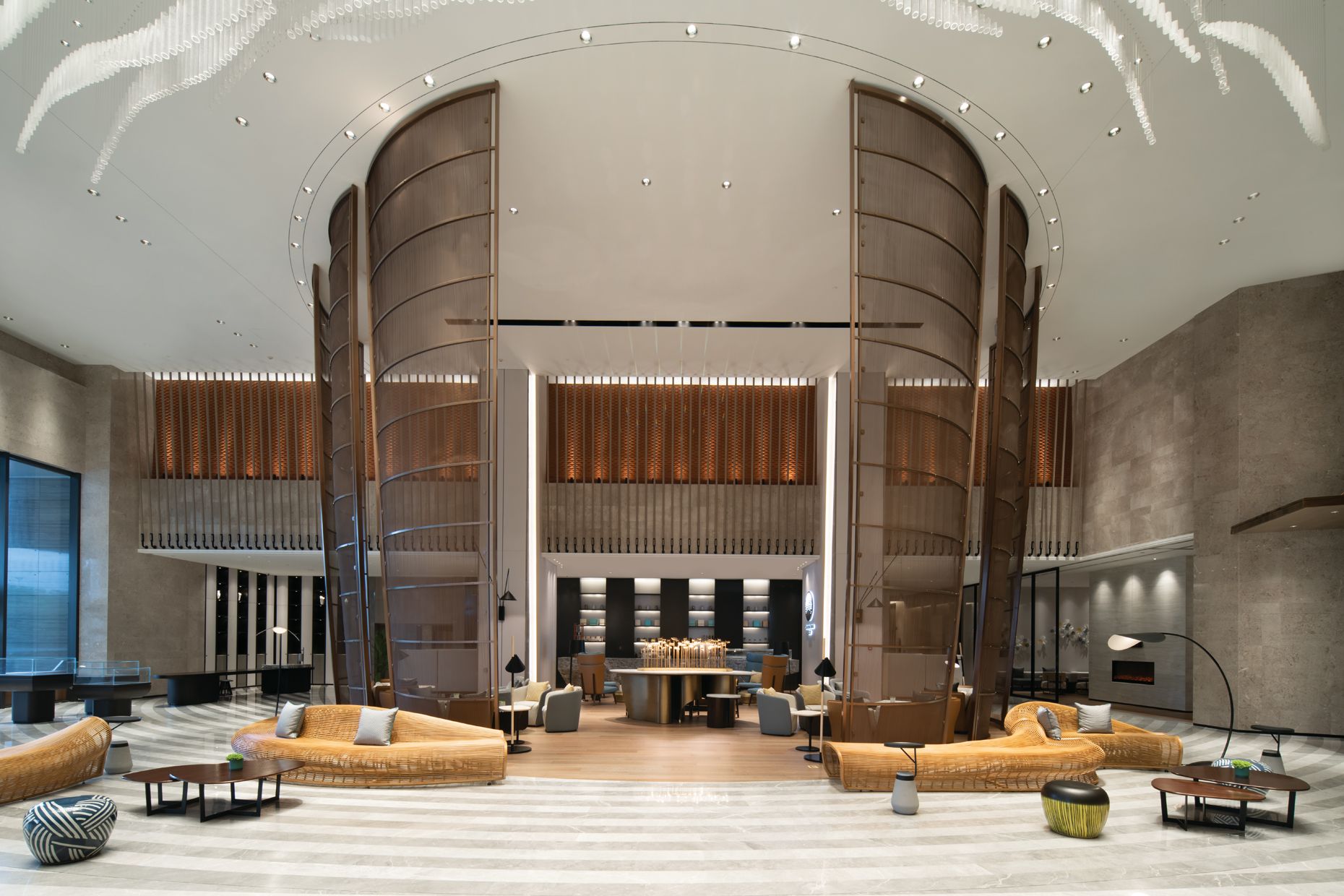 首站,在朱总监的热情引领下,我们步入宽敞明亮的大堂。入口处两只皇冠假日酒店品牌独家打造的原创IP“皇冠家族”玩偶以憨态可掬的形象,瞬间消解了陌生感,以亲切灵动的姿态拉近了我们与酒店的距离。
