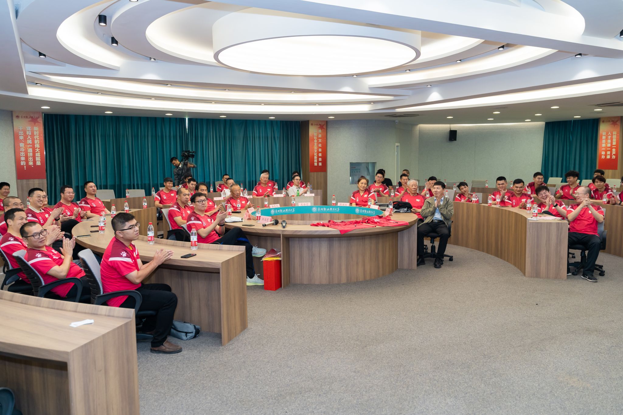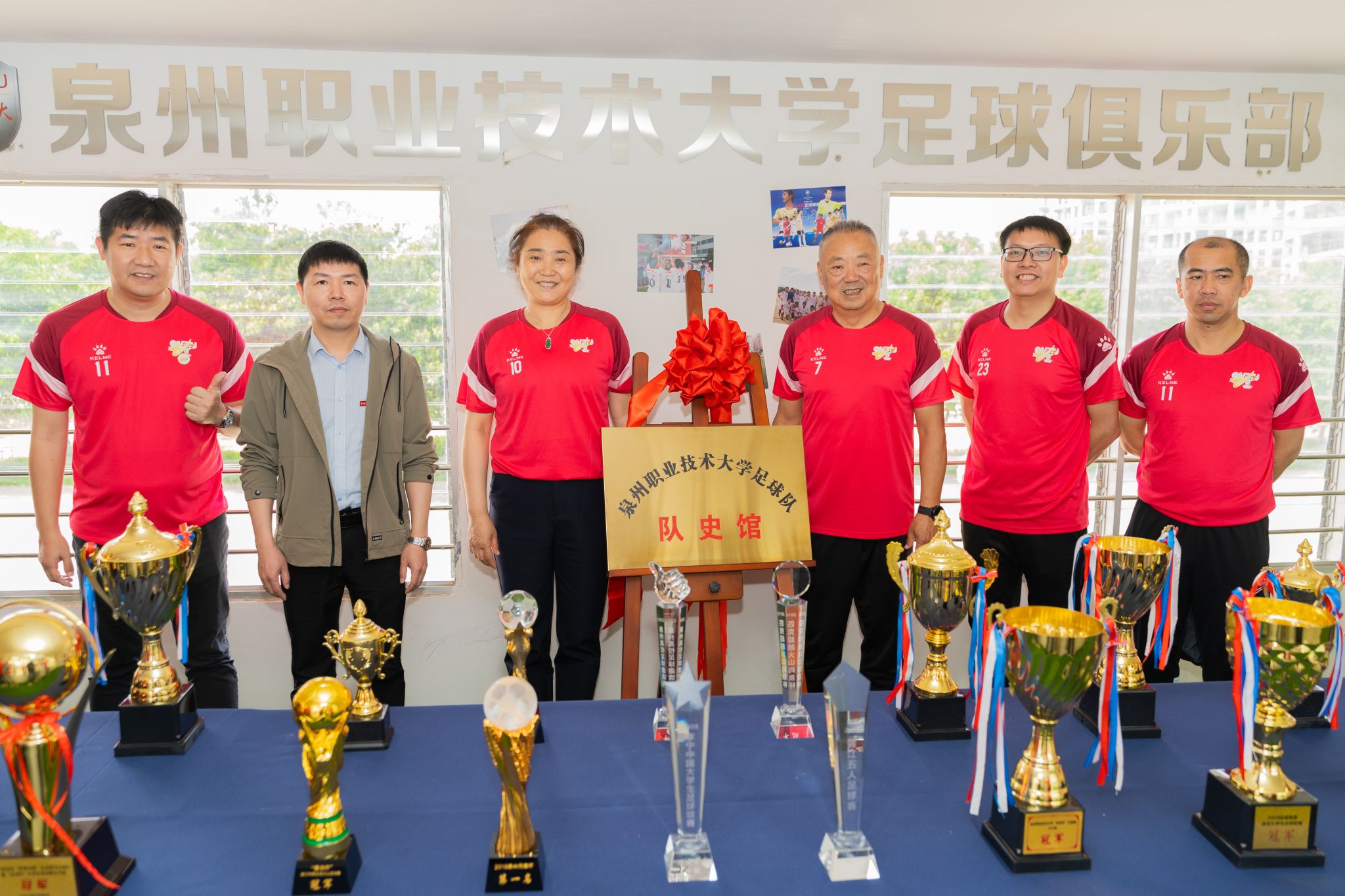 随后,大家前往泉大足球队队史馆一同参加了揭牌仪式,并参观了队史馆。泉州职业技术大学足球俱乐部目前下辖四支队伍:泉大足球俱乐部队(由泉大校友以及关心和支持俱乐部发展的社会人士组成)、泉大教职工足球队、泉大男子足球校队、泉大女子足球校队,已服务了国际大体联世界杯、亚洲大体联亚洲杯、全国青少年校园足球夏令营以及中超联赛等众多大型赛事,迄今已为社会各界成功培养和输送足球教练、裁判和运动员400多名,为校园足球的发展做出了贡献。俱乐部的品牌精神:泉力以赴,永不言弃!在这种精神的引领下,泉大足球俱乐部20年来斩获省大学生足球联赛冠军等市级以上比赛冠军20多项,已成为泉州足坛不可或缺的重要力量。队史馆内陈列了足球俱乐部20年来获得的部分重大奖项,以及五个发展阶段球衣展示。