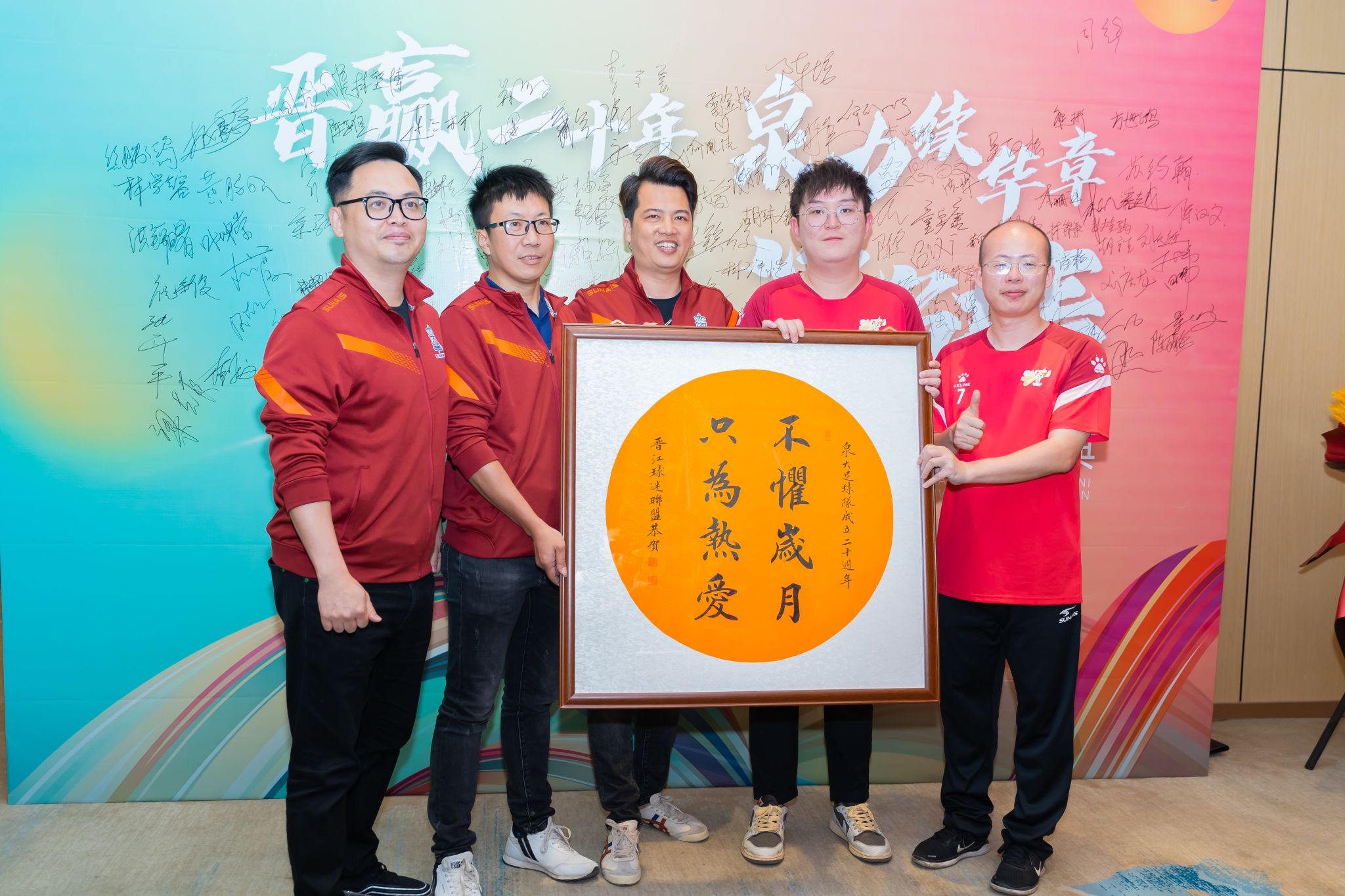 2015年,泉大足球校友会成立,会员现已遍布全国各地以及海外地区。就职典礼上,理事长黄腾蛟表示泉大足球校队、校友队通过校友会这个平台相辅相成,互相成就,这也是一种传承的力量和精神,足球校友会发展,一日千里,未来可期。会长王建代表球队向吴金营董事长赠送了会员集体签名的20周年纪念球衣。张悦虹向泉大赠送了20周年特别定制版的国家队球衣。一直关心支持泉大足球发展的吴金营董事长发表了热情洋溢的讲话,对返校的校友表示欢迎,对球队表示祝贺,祝愿泉大足球队蓬勃发展,并和与会代表合影留念。
