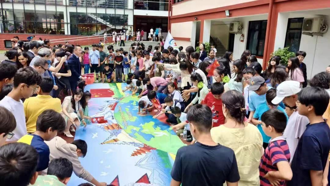 在互动环节,现场气氛格外热烈,青少年沙画选手热情教尼泊尔学生制作固彩沙画,中尼小朋友们开心地互赠具有民族特色的纪念礼品,并携手合作创作了一幅象征中尼友谊的巨幅地面沙画。