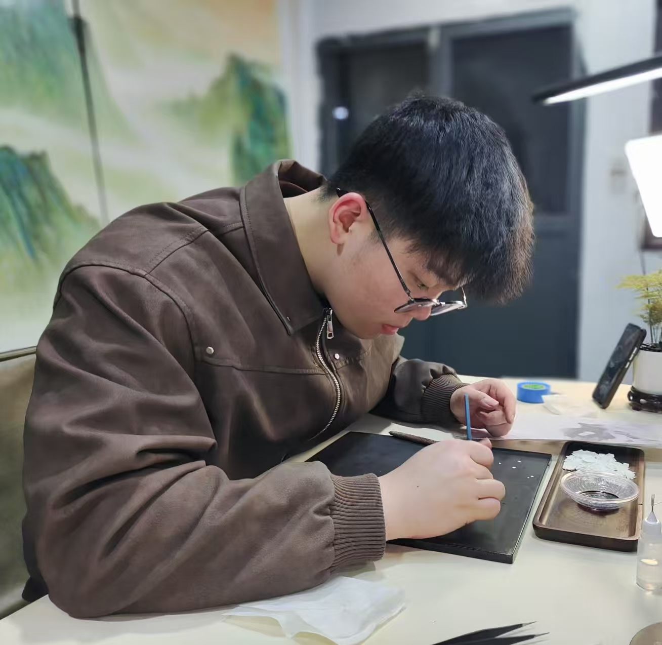 2023年大学毕业,李宇峰毫不犹豫地选择加入福州漆艺保护基地,将全部热忱与精力投入大漆行业。入职首日的蛋壳镶嵌实践,让他一头沉浸于指尖的创作,浑然忘却时光流转。这份沉浸式的热爱,更坚定他心底的信念:“大漆的独特材质肌理与深厚文化底蕴,是值得用一生去钻研的事业。”
