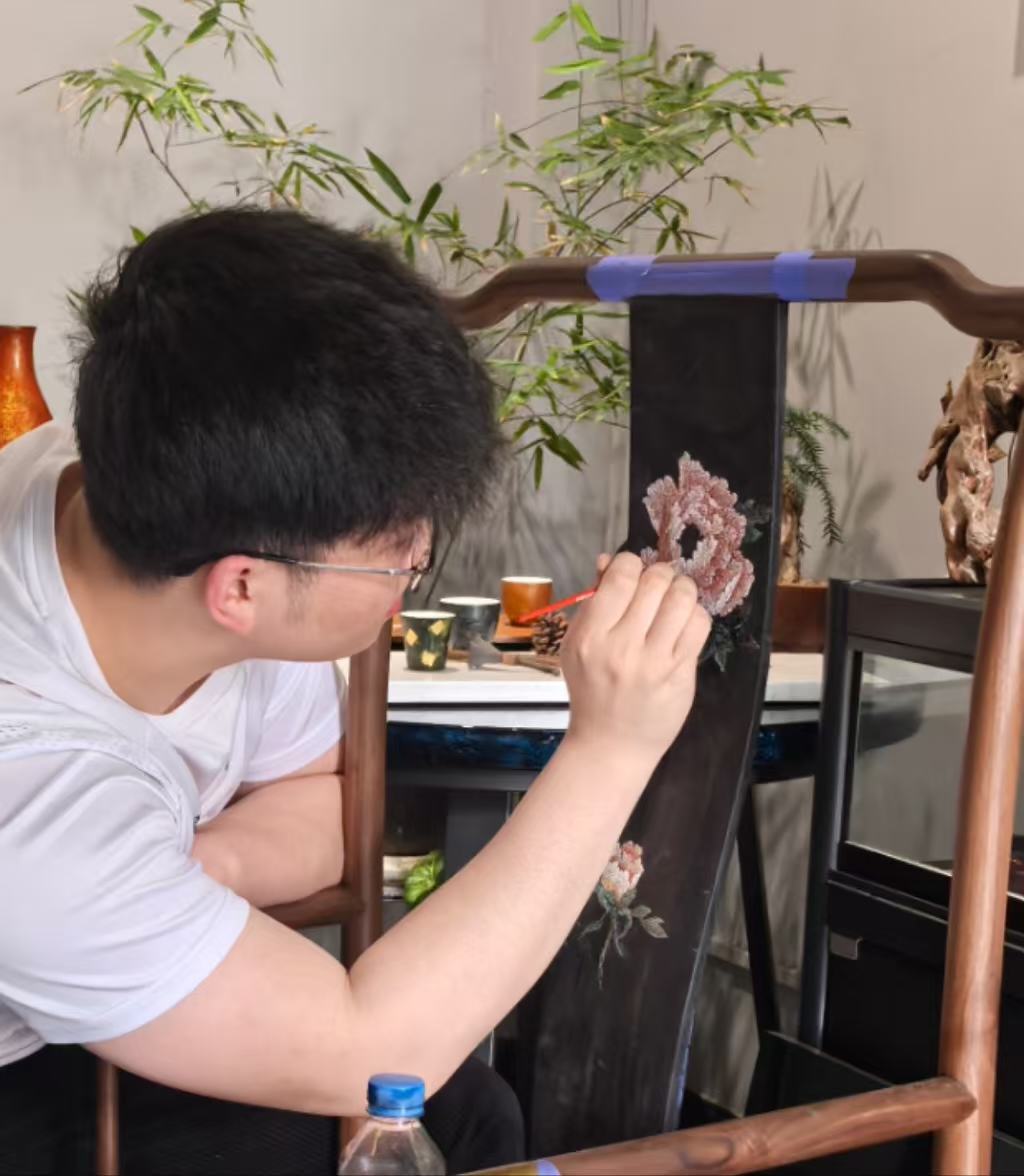 从初入行业的新人成长为如今的工艺美术师,从普通从业者跻身行业协会成员,李宇峰的进阶之路,铺满日复一日的坚守与打磨。在基地的工作中,他构建起“创作增收、技艺精进、职称提升”的三维成长体系,承接私人定制漆画与器具保障生活来源,聚焦作品创新打磨核心技艺,按标准推进职称申报实现阶段突破。面对各类漆艺技法的挑战,他始终以“问题导向”深耕实践,在一次次材料调试、工艺优化中攻克难关。而客户的每一次认可、每一句赞赏,都化作最坚实的动力,推着他在传承与创新的道路上稳步前行。