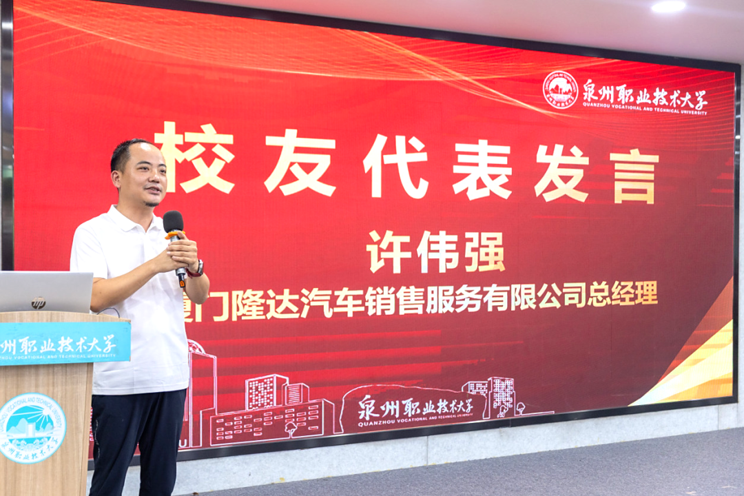 校友代表许伟强则以“创业者的摇篮”为切入点,分享自己与泉大的故事。他回忆,入校第一天便被校园里“创业者的摇篮”标语深深触动,在校时积极参与创业社会实践,创建“社会服务中心”,这份经历为他后来的职业发展埋下了种子。结合自身成长,他建议学弟学妹积极锻炼身体、保持良好状态,学会利用资源,秉持“爱一行做一行”的态度,稳步成长。