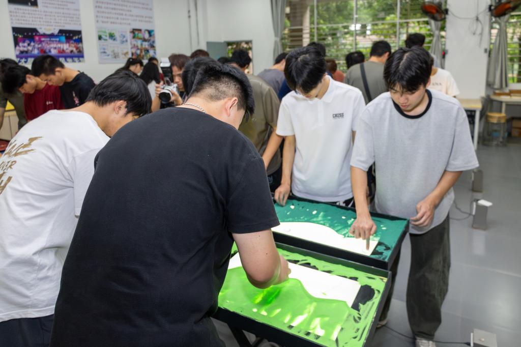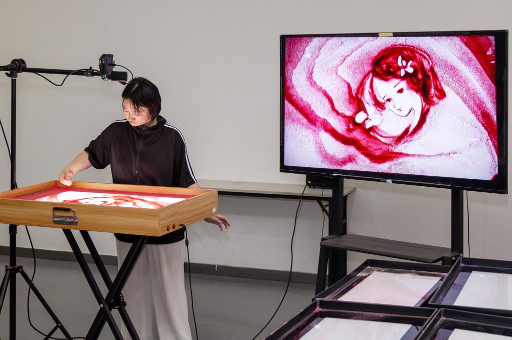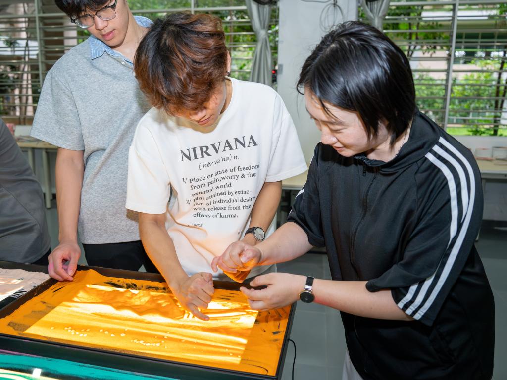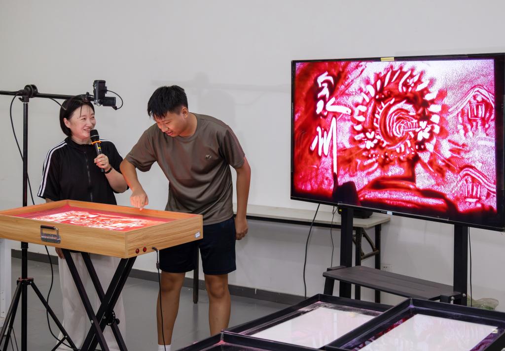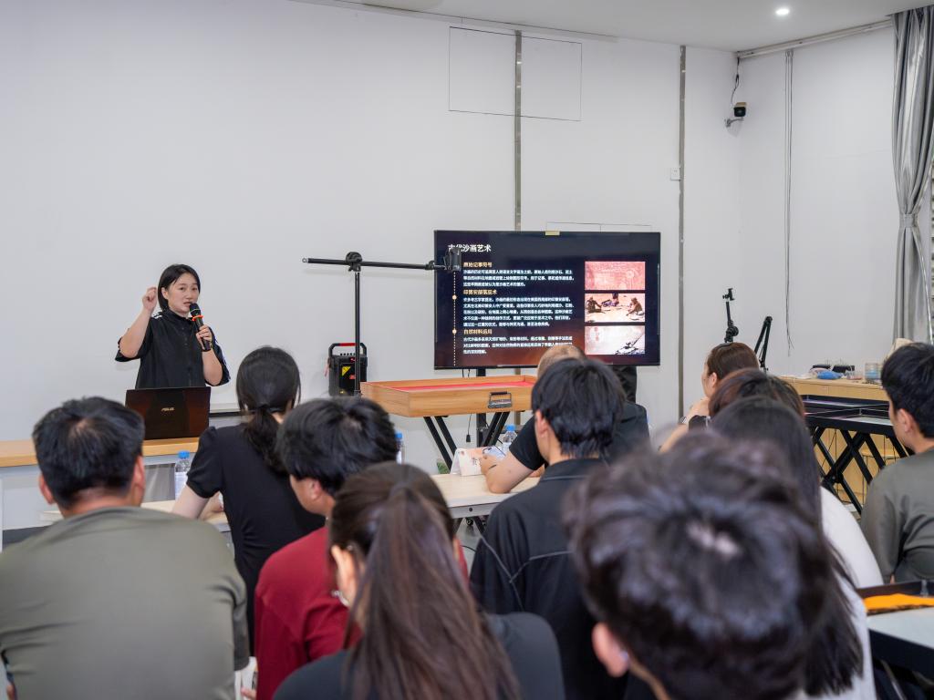 在体验环节,张浏清分步示范抹沙、挥沙、画沙等基础技法,引导同学们手执细沙跟随练习。同学们在创作中感受沙粒在光影下的变幻魅力,指尖流淌的不仅是艺术技法,更是对自然灵性的捕捉与艺术生命力的唤醒,让艺术感知在沙的轨迹中逐渐具象。