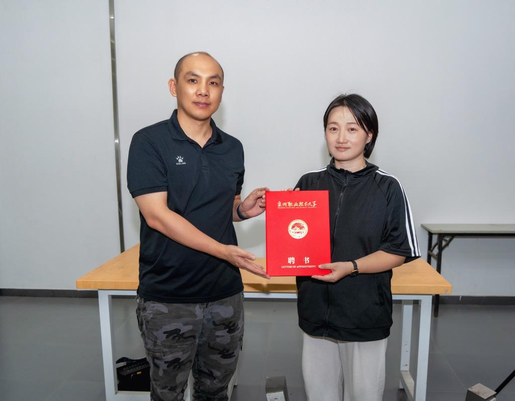 ▲学生工作处副处长、校团委书记、校友总会副秘书长黄胤聪颁发“校友导师”聘书
