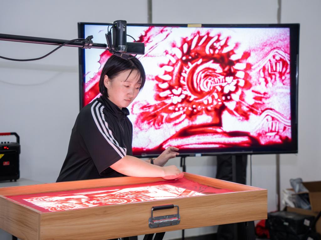 伴随着泉州市丰泽区文化旅游宣传曲《素馨》的旋律,张浏清以沙为墨、以台为纸,指尖翻飞间勾勒出泉州蟳埔簪花与德济门遗址的轮廓。她以沙画艺术生动诠释海丝文化的千年底蕴,将其娓娓融入流动的沙影之中。