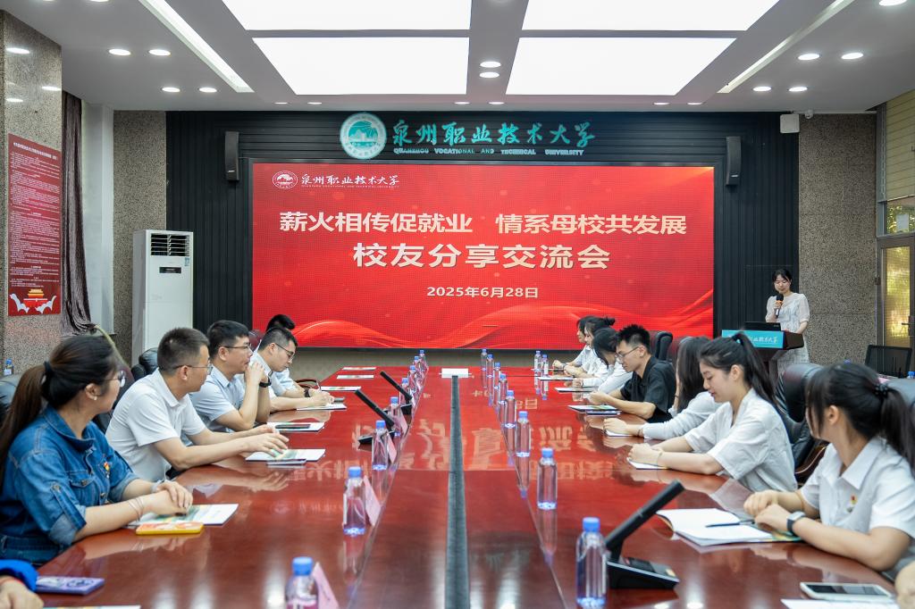 6月28日,泉州职业技术大学校友总会联合拾德书院、商学院举办“薪火相传促就业,情系母校共发展”校友分享交流会。学校党委副书记、副校长、校友总会理事长蔡金佩,商学院党总支书记叶城锋,拾德书院党总支书记王秋玲等师生代表参会,2010届市场营销专业校友及泉州、莆田校友会代表受邀返校分享。