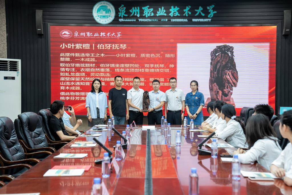 莆田校友会理事会代表向学校捐赠“小叶紫檀——伯牙抚琴摆件”。此藏品以“子期识伯牙”的典故,喻指泉大如知音般识才赏能、育木成器,既借此敬谢恩师培育之恩,更祈愿母校教泽绵长、桃李满天下。