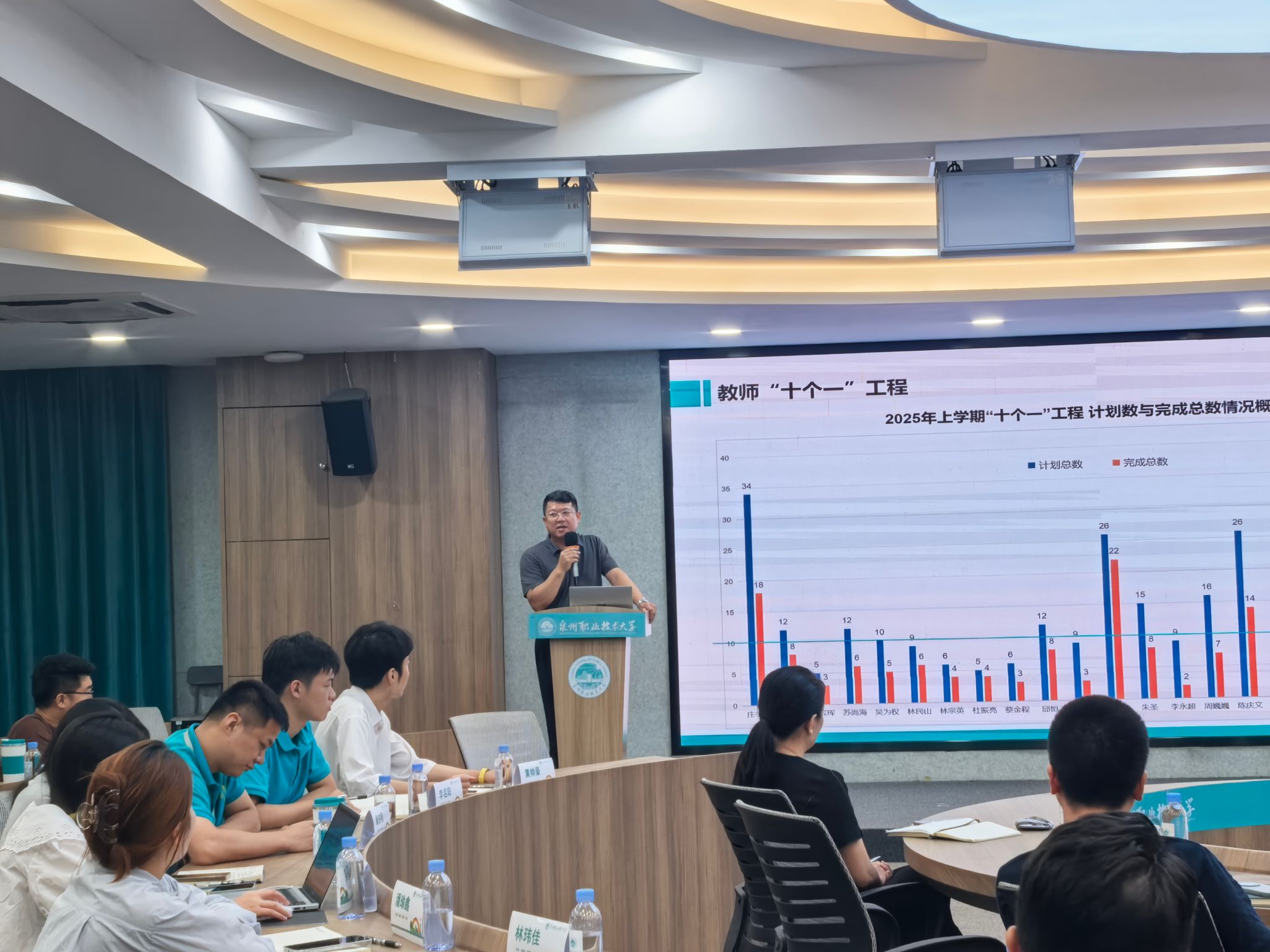 郭霏霏副校长总结了学院上半年取得的成绩,包括荣获泉州市科技副总、福建省现代产业学院优秀案例特等奖、国际发明展金奖、福建省高校工程研究中心、泉州市科技计划项目等重要荣誉,并有多名学生进入华为、安恒、阿里等头部企业就业。他强调,新学期要继续推进"十个一"工程,鼓励教师积极参与教科研与社会培训,紧跟产业发展,上好"开学第一课",共同推动学院内涵式发展。