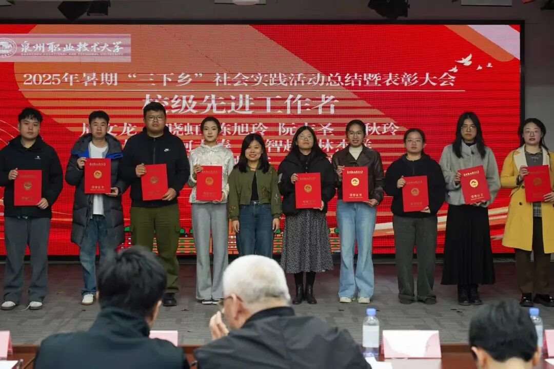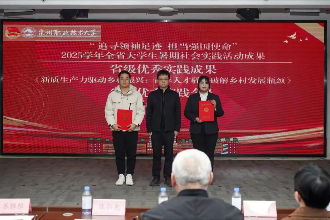 暑期,泉州职业技术大学联合创新产业学院发挥专业技术优势,携手校团委统筹开展暑期社会实践工作,其成果《新质生产力驱动乡村振兴:青年人才驿站破解乡村发展瓶颈》成功斩获“追寻领袖足迹 担当强国使命”2025年福建省大学生暑期社会实践“优秀实践成果”;联合创新产业学院党总支书记林江鸿作为指导老师获评“优秀实践个人”;潘晓虹老师荣获“校级先进工作者”称号。