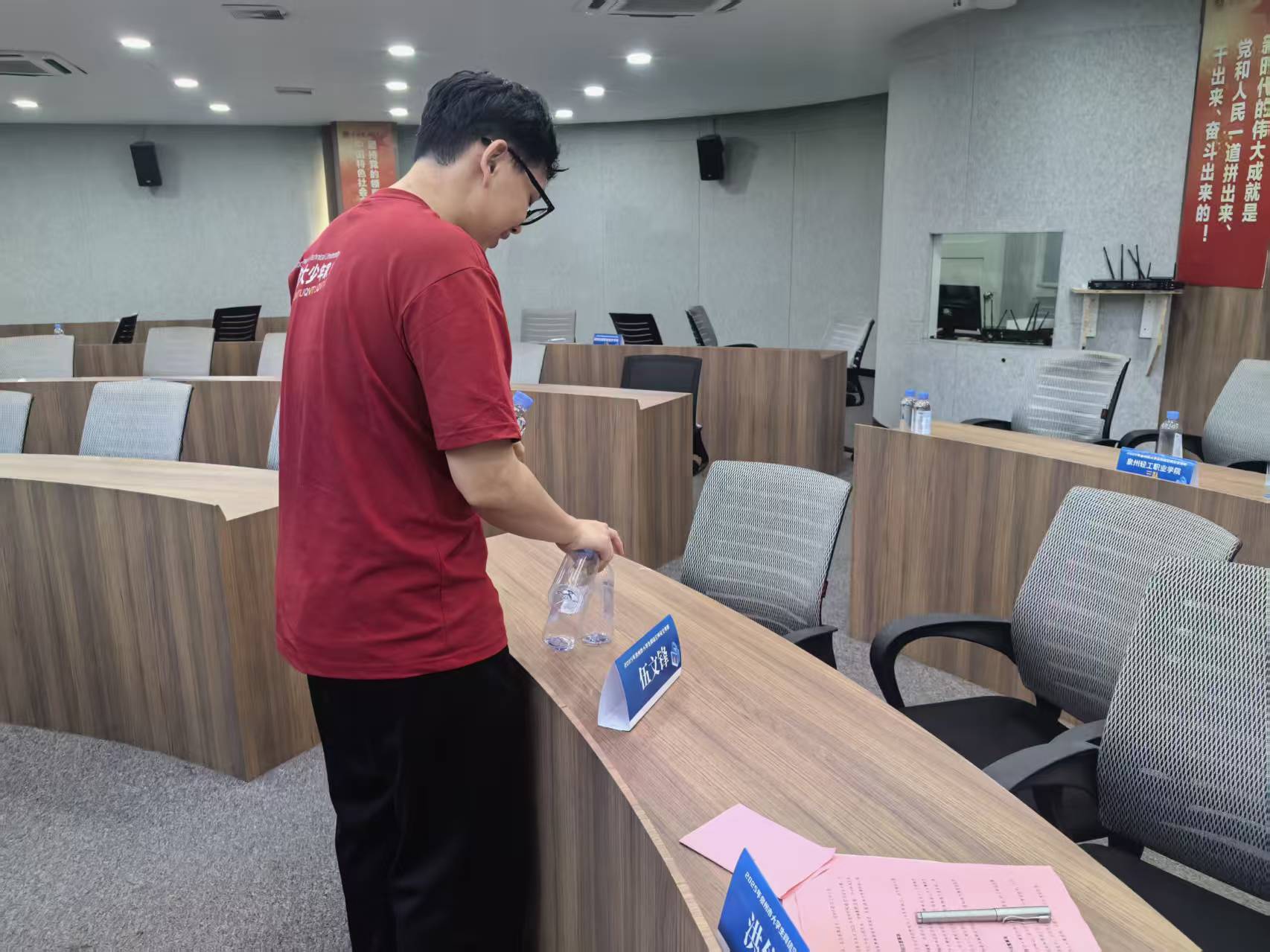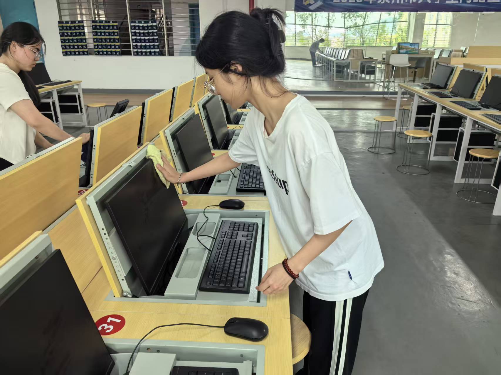 赛期间,志愿者团队围绕赛事需求,分工协作、高效服务。赛前,志愿者先是对 A401、A501 赛场及 A301 签到厅进行全面清扫,擦拭桌椅、清理杂物,确保场地整洁有序;随后按赛事规范布置赛场,摆放电脑设备、调试网络环境,同时整理签到物料,将选手信息表、参赛证分类摆放整齐。再是引导选手进入教学楼A301签到并举行开幕式,为大赛顺利开局奠定基础。