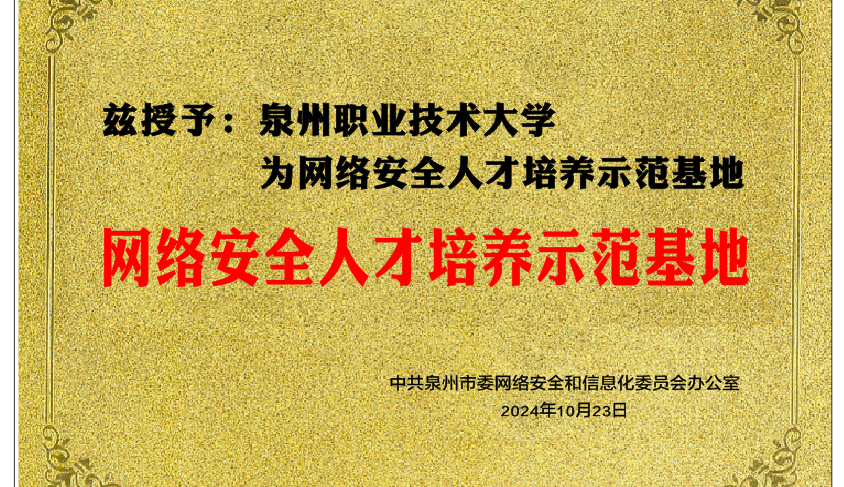2024年12月,泉州市网信办授予我校“网络安全人才培养示范基地”