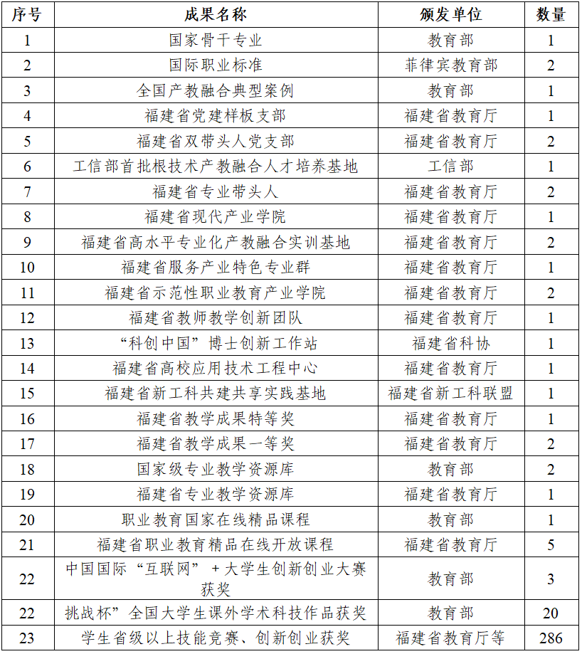 学院有国家骨干专业1个、省级示范性专业1个、省级应用技术工程中心1个、“科创中国”博士创新站1个;获得福建省教学成果特等奖1项、一等奖2项;主持编制国际职业标准2项、教育部专业标准2项;是华为全国人才培养示范样板点、奇安信全国人才培养示范基地。形成“五位一体”的职业本科教学质量保障体系,并在2024年全省教育评价改革推进会上做大会报告。