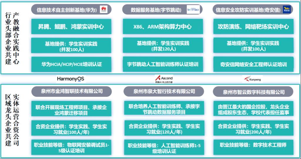 泉州职业技术大学与华为于2019年合作成立“华为ICT学院”,开设计算机应用工程、软件工程技术、信息安全与管理3个职业本科专业,率先培养人工智能、物联网、大数据等信创领域的高层次技术技能人才。主持编制了全国职业本科计算机工程技术、软件工程技术专业简介及标准,参与编制工信部根技术行业标准2项。项目建设五年间,共培养信创人才3000人,“双轮驱动”的联合培养模式入选教育部产教融合典型案例。2023年,学校挖掘区域产业痛点和共性需求,锚定产业数字化和数字产业化为主要方向,推动产教融合由浅入深、由虚变实,切实助力产业提质增效。总投入6000万元,与华为原厂合作,建设基于昇腾、鲲鹏、鸿蒙三大根技术基座的信创实验室,并将“华为ICT学院”升级为“联合创新产业学院”,增设人工智能工程技术、物联网工程技术、智能网联汽车工程技术3个职业本科专业,重点打造服务区域产业智改数转的新一代信息技术专业群。获批工信部首批根技术联合创新产教融合基地、省新工科教育联盟共建共享基地,与数字泉州建设办公室、泉州人社局、华为公司签订四方协议建设泉州市首个高技能数字人才培养基地。在福建省率先开展“3+4中本贯通”信创人才培养,与地方龙头企业在校内共同组建专注于鸿蒙原生应用开发的合资公司,与行业头部企业在学校设立实体化运营的信创中心,与中科院共建信创重点实验室。形成“部省市政府统筹、中高本校校贯通、实体化企业运营、平台化行业服务、根技术科研创新”,政校行企研“五位一体”,教育链、人才链与产业链、创新链“四链融合”,推进“五金”新基建,夯实职业教育“五重点”的信创人才培养体系。