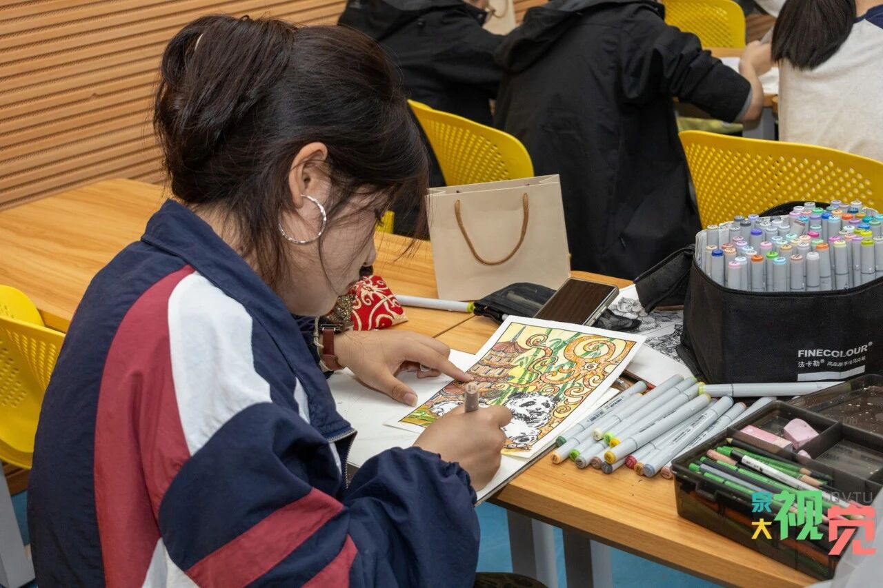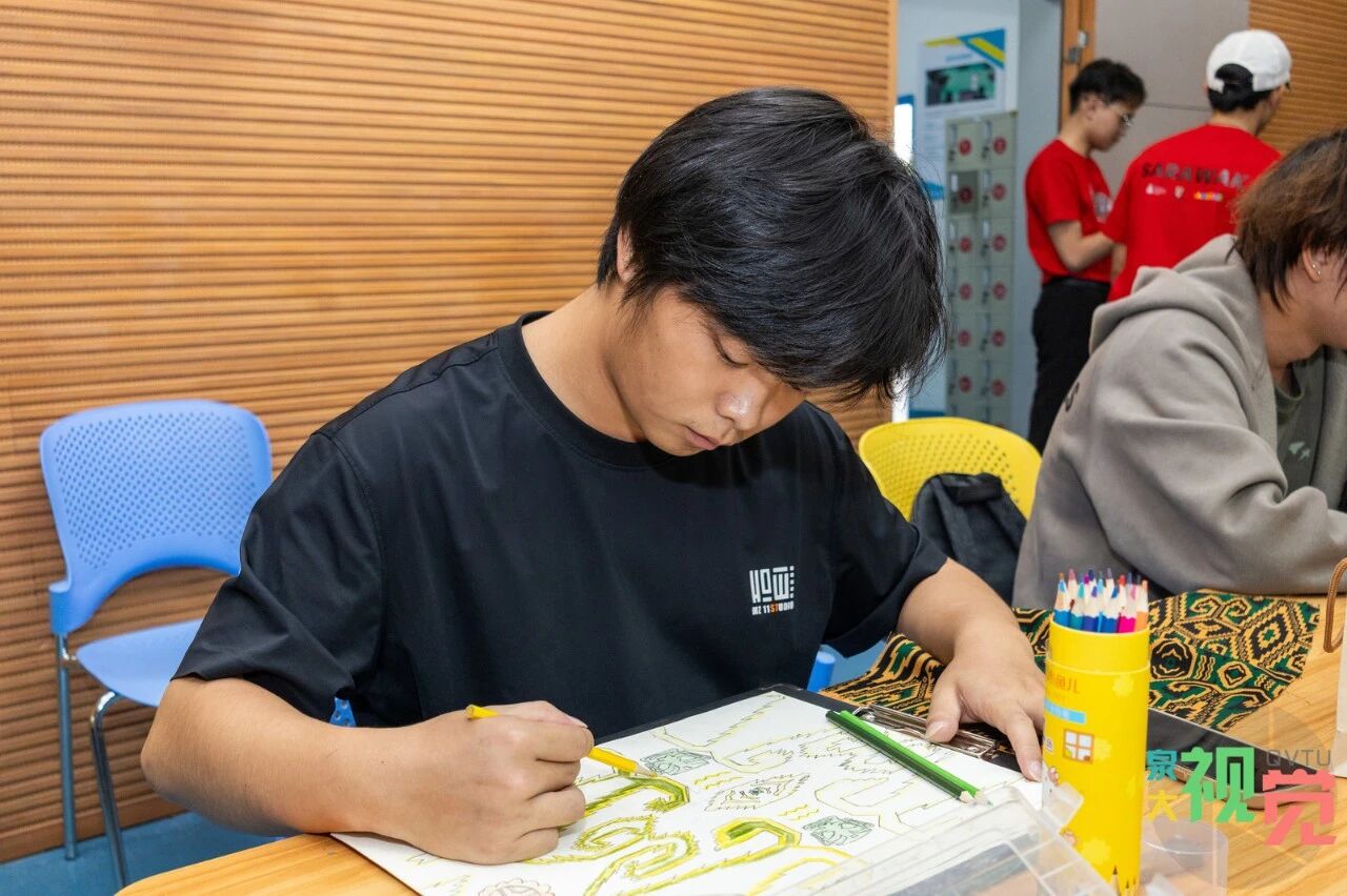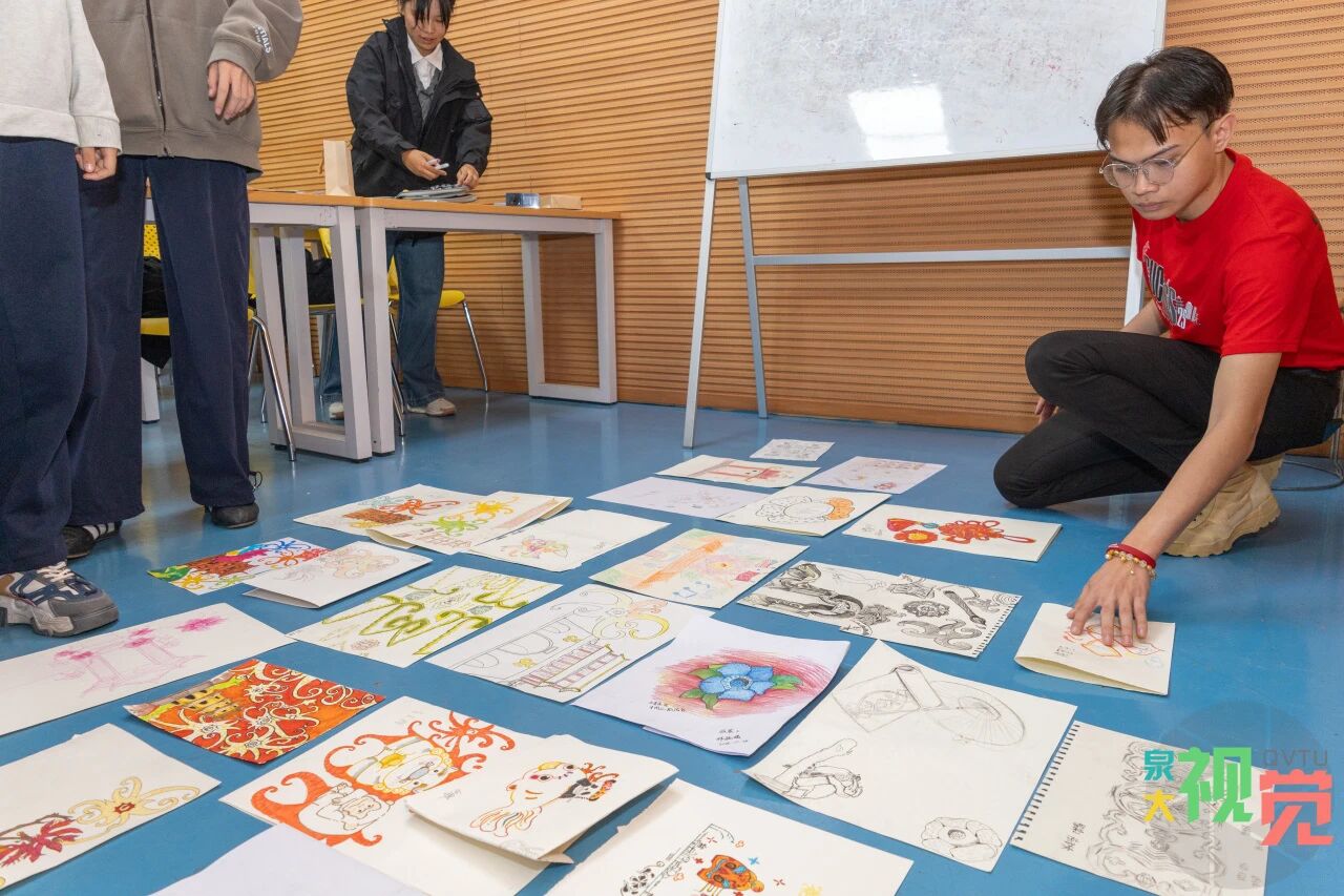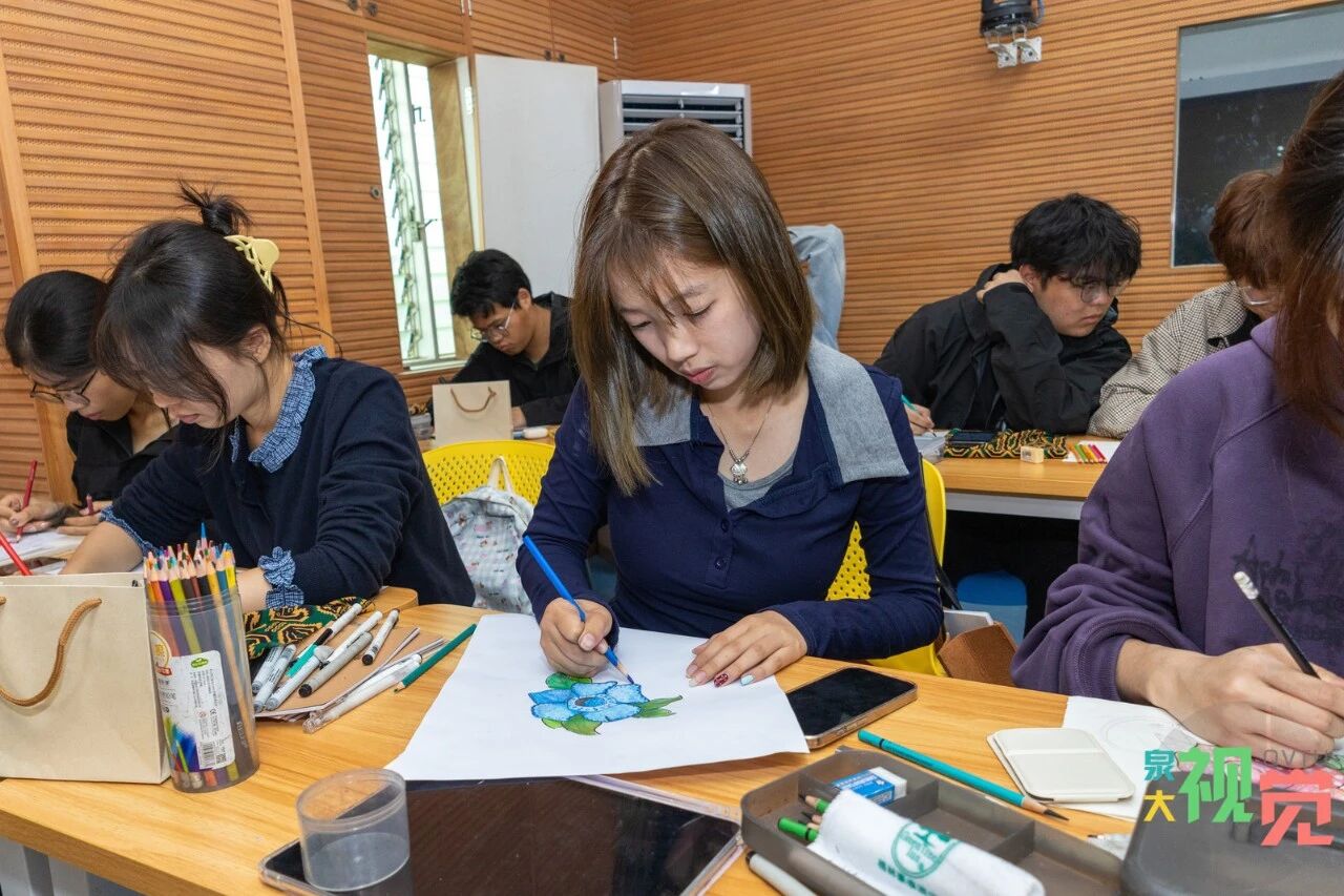 25级服装与服饰2班 蔡心妍说:““刚开始还担心热带元素和中式纹样会冲突,跟着艺术家学习后才发现,只要抓住线条的韵律感,犀鸟的灵动和缠枝纹的缠绵能完美契合。这就像中马文化,看似不同,却在审美意趣上有着天然的共鸣点。”