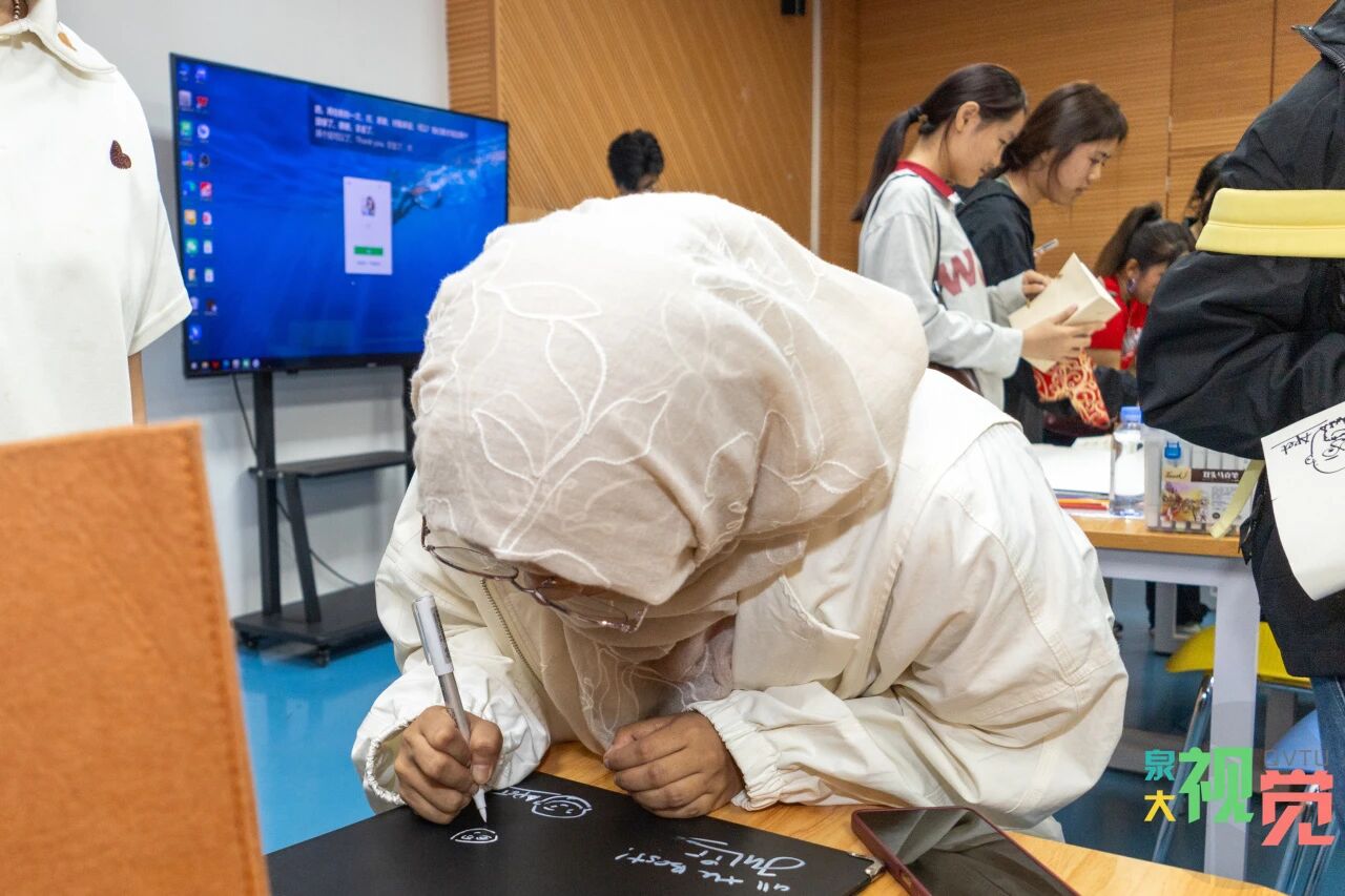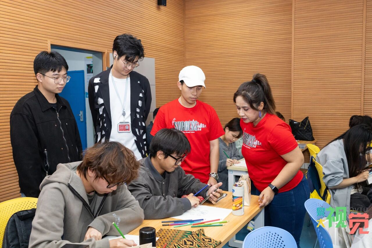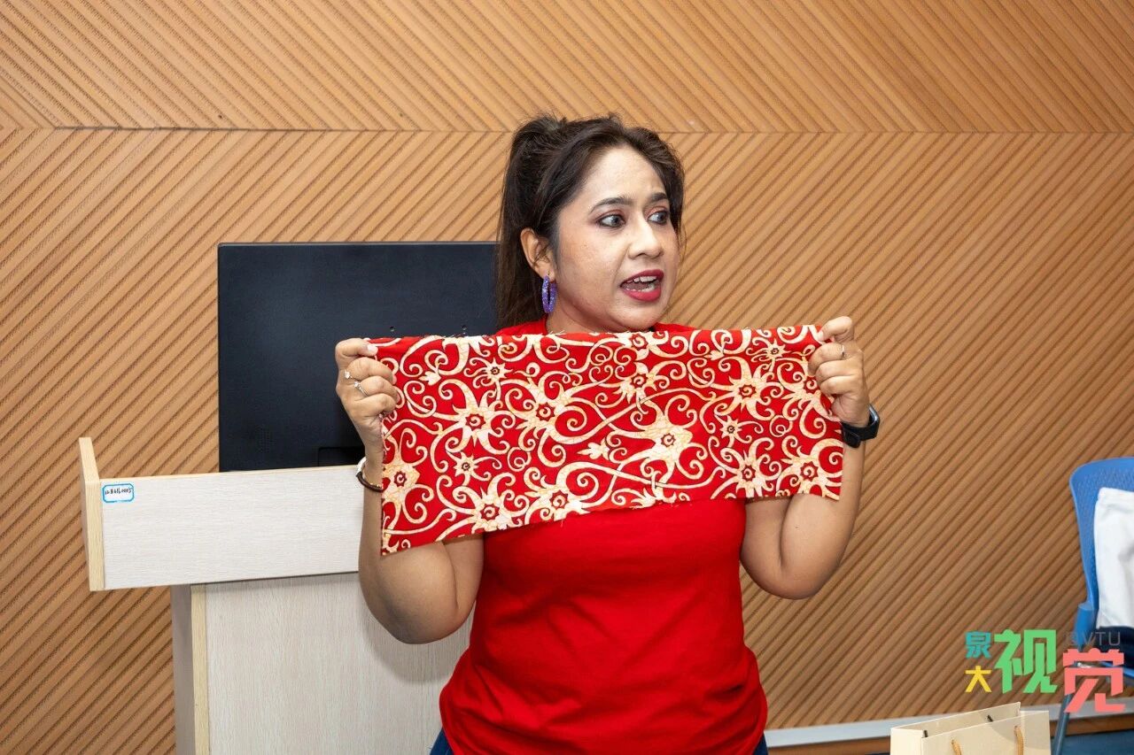 “看这Midin蕨类的叶脉,是雨林最灵动的线条;大王花的花瓣,藏着大地的厚重纹理。”活动伊始,来自马来西亚WAN.JULIANA.EMEIH.WAHED博士化身“文化向导”,伴着PPT上砂拉越州的雨林影像娓娓道来。她展示着当地艺术家的创作:犀鸟羽毛纹样绣在织物上,红毛猩猩轮廓融入服饰设计,每一件作品都是自然与文化的共生。学子们听得入神,笔记本上很快记满了自然元素与文化符号的注解。