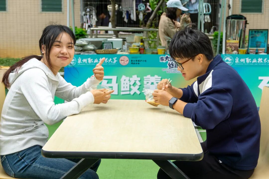 美食是本次交流的主角。现场25个美食摊位依次排开,划分为“寻味刺桐”泉州古早味区、“食贯南洋”国际风情区及“吃在泉大”青春创意坊。马来西亚的叻沙与竹筒鸡、泰国的特色风味、菲律宾的经典小吃,与泉州的马鲛羹、虾饼、润饼、四果汤等晋江美食同台飘香。来自马来西亚玛拉工艺大学沙捞越校区的陈思文讲师兴奋地分享道,“我们品尝了晋江美食,口味非常棒!”许多马来西亚、菲律宾、泰国同学在品尝润饼、四果汤等地道晋江小吃后,也连声称赞“特别喜欢”。