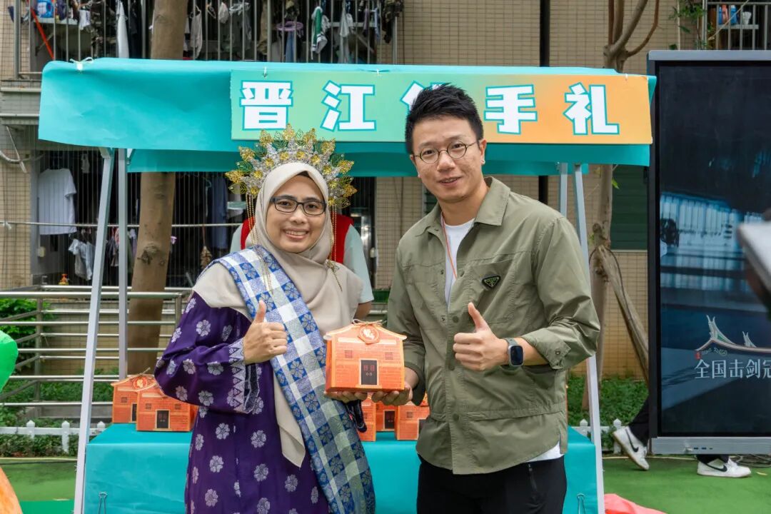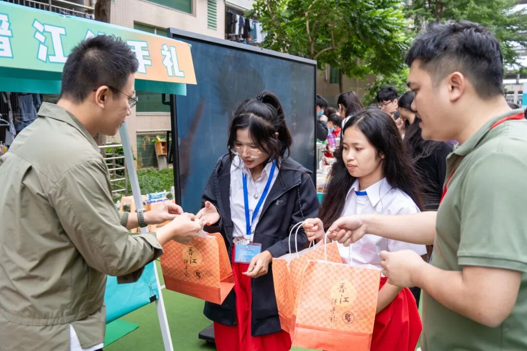 ▲ 晋江文旅集团为东南亚师生准备了独具晋江风味的伴手礼,我校党委宣传部/品牌传播部部长杨颖聪为他们送上伴手礼