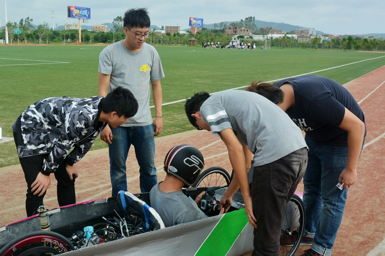 在调试现场,来自台湾大叶大学机械与自动化学系的赖永伦与他的团队们正紧张地调试着汽车,在汽车的驾驶台上连接着调试电脑以及各种复杂的线路,队员们正忙碌地观察着各种数据。“指标一切正常,可以试跑。”队员们说。赖永伦带上头盔,钻进了调试车里。“轰……”随着一声低沉的轰鸣声,调试车缓缓地向前跑去,速度越来越快,一圈两圈……随着车的跑动,发动机、供油系统等各种数据都在电脑上呈现。队员们分析着数据。