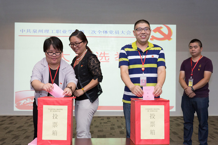 的批复》、《中国共产党泉州理工职业学院第三次党员大会关于中共泉州理工职业学院委员会工作报告的决议》、《中共泉州理工职业学院第三次党员大会选举办法》,审议通过选举办法、监票人、计票人名单,并按照选举办法规定的程序,以无记名投票差额选举方式进行了选举。经过当场计票、严肃监票,选举产生了林其天、吴金营、吴滨如、黄志梅、庄文瑞、陈其生、杨津平、钱玉琴、林文艺等九位同志为中共泉州理工职业学院第三届委员会委员。