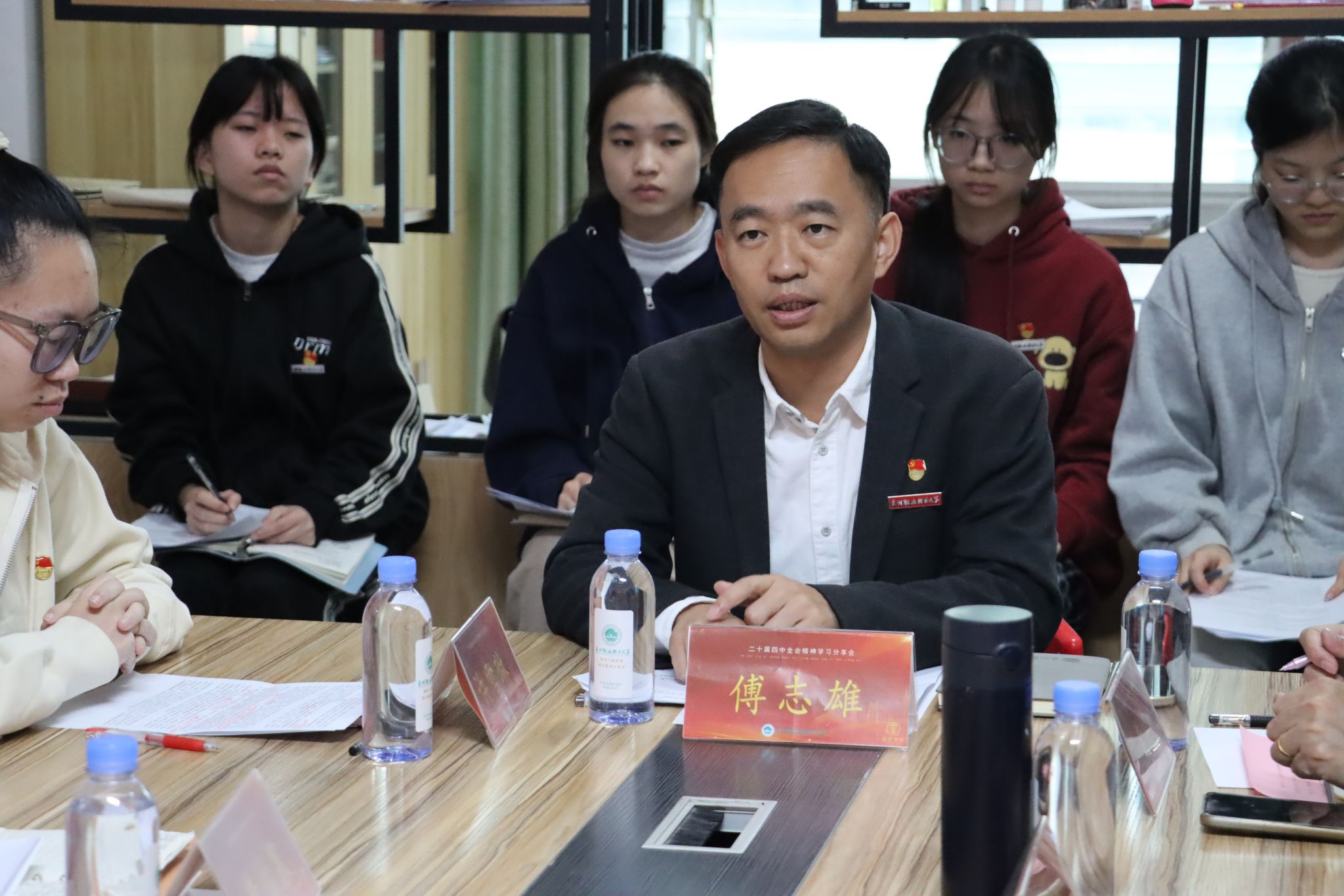 傅志雄在点评中肯定了同学们的学习成果,并围绕党的二十届四中全会精神作了专题宣讲。他系统回顾了我国五年规划的发展历程,深入阐释了“十五五”时期的战略定位,分析了当前发展形势与目标任务,强调要把学习贯彻全会精神与落实立德树人根本任务紧密结合,激励青年学子勇担时代使命。