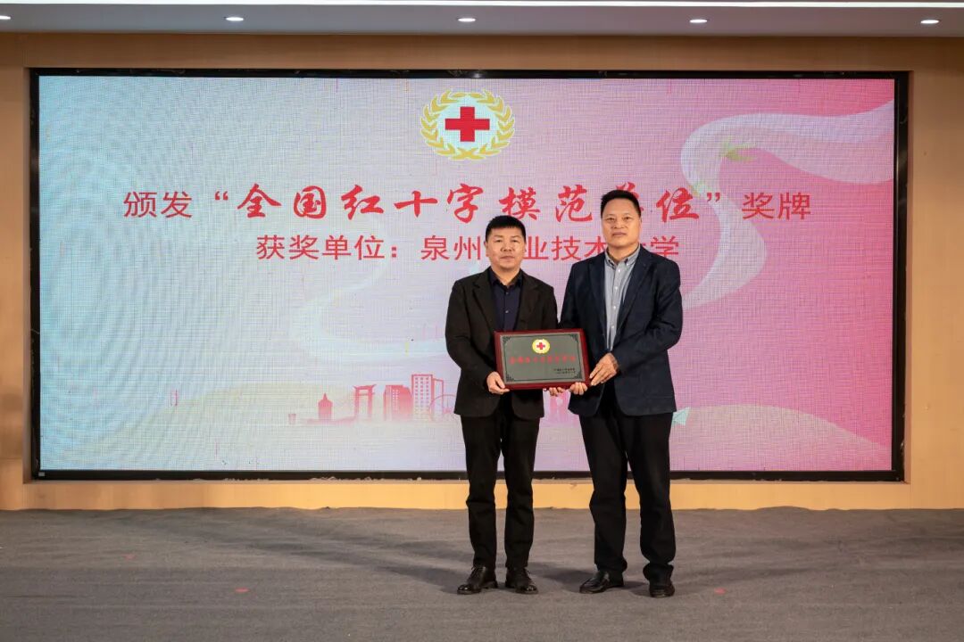 活动现场还举行了特殊的荣誉授予仪式。近日,中国红十字会总会公布全国红十字模范单位表彰对象,泉州职业技术大学成功入选,成为福建省11个获此殊荣的单位之一。福建省红十字会秘书长兼事业发展与交往联络部部长吴联妙为泉州职业技术大学颁发荣誉牌匾,蔡金佩副校长代表学校接牌,这一荣誉不仅是对我校红十字工作的高度认可,更为全市高校红十字事业高质量发展树立了先进典范与示范标杆。