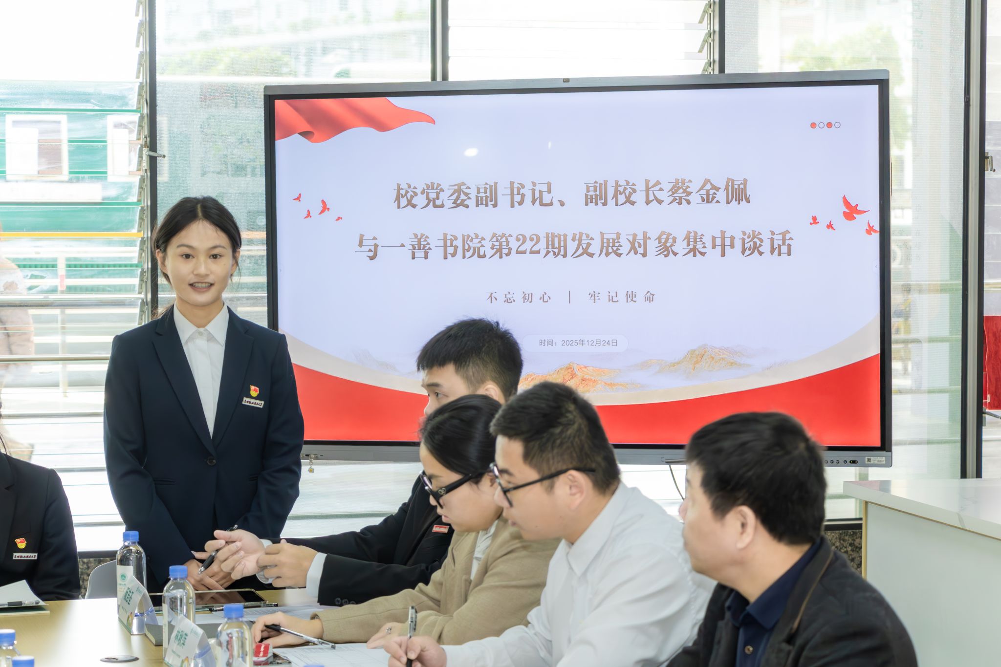 如何引导青年学子扣好人生第一粒扣子?怎样将立德树人融入日常点滴?12月24日中午,泉州职业技术大学一善书院举行了一场别开生面的师生交流会。校党委副书记、副校长蔡金佩与第22期党员发展对象及青年学生代表围坐一堂,围绕理想信念、成长成才与使命担当等话题展开深入交流,为同学们带来一堂生动而深刻的思想成长课。