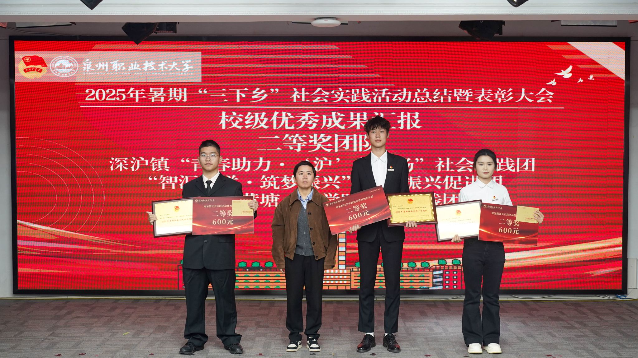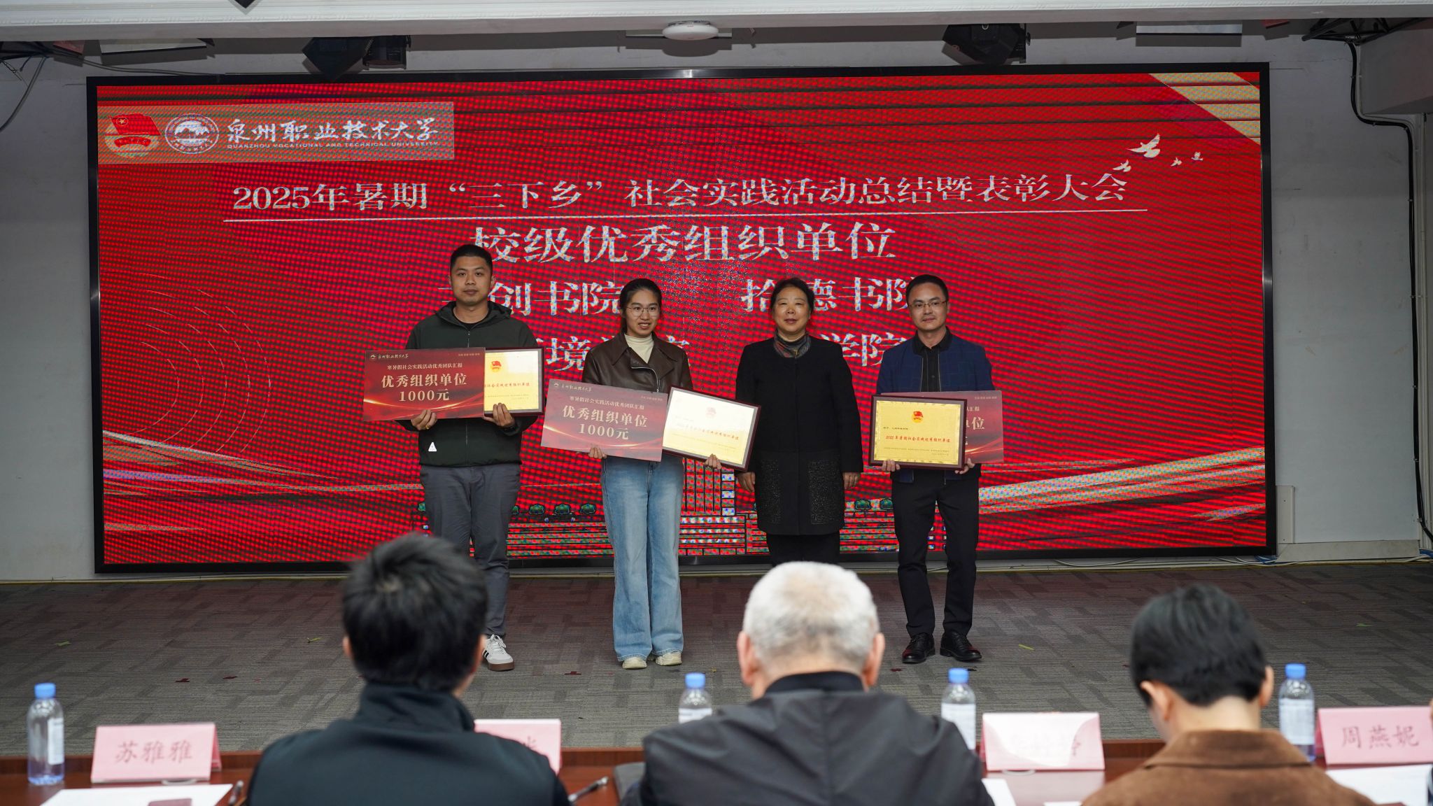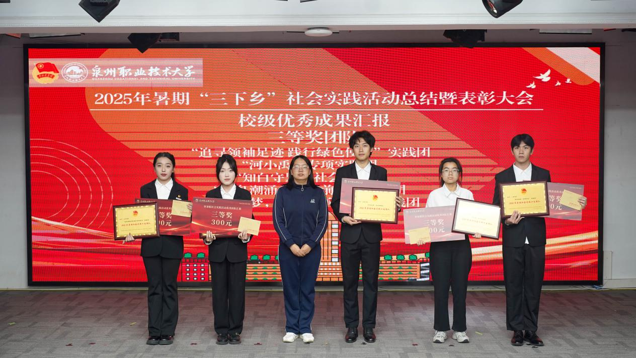 12月4日,泉州职业技术大学2025年暑期“三下乡”社会实践活动总结暨表彰大会在A633报告厅举行。晋江团市委副书记陈弘光,晋江团市委二级主任科员、组织部副部长李婷婷博士,内坑司法所所长苏雅雅,校务顾问、马克思主义学院首席专家来永宝,马克思主义学院院长杜秀娟,学工处处长、校团委书记黄胤聪,以及教务处、学工处、各二级学院负责人、各书院党团书记、实践团队指导老师和学生代表共同出席。