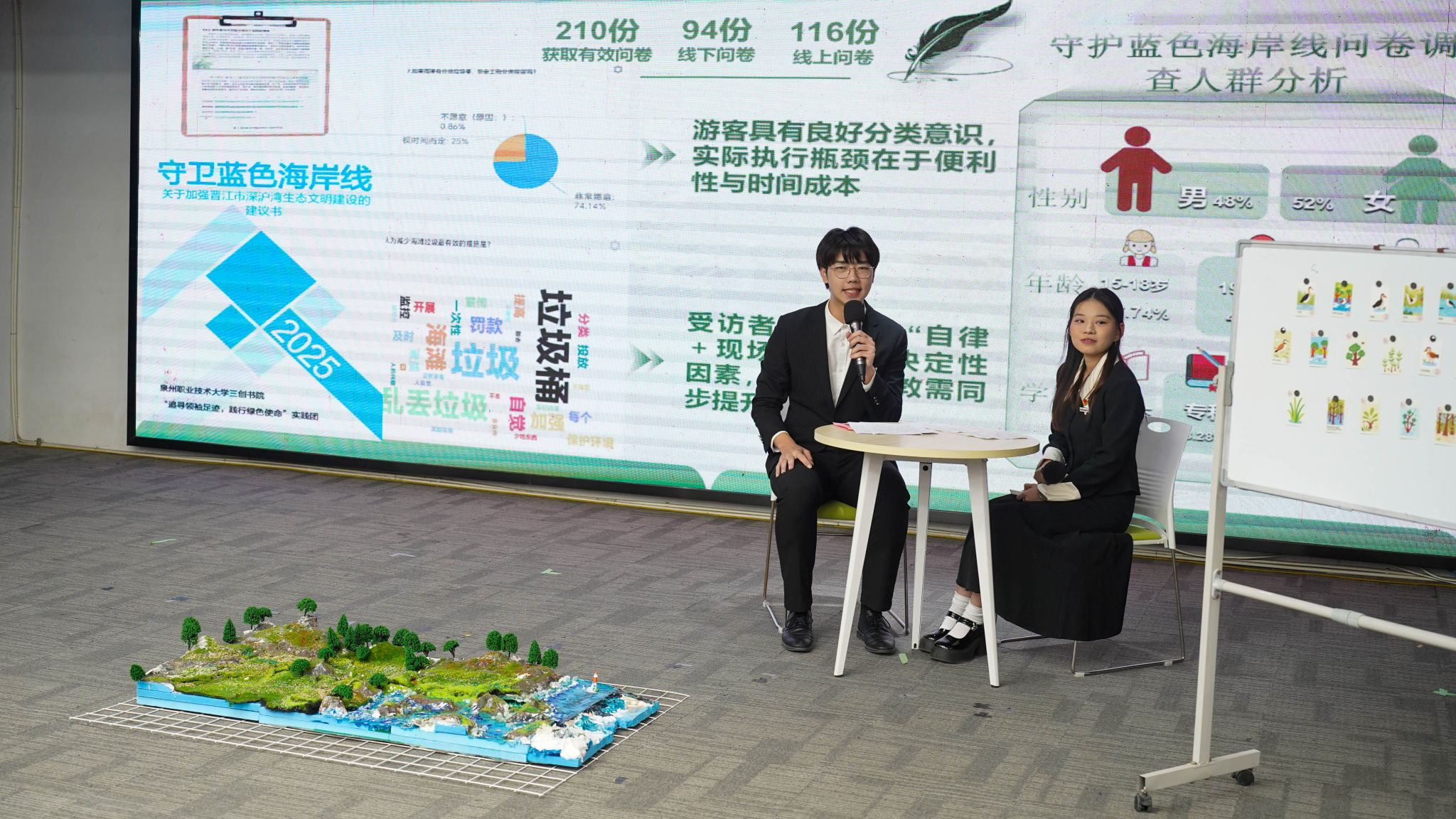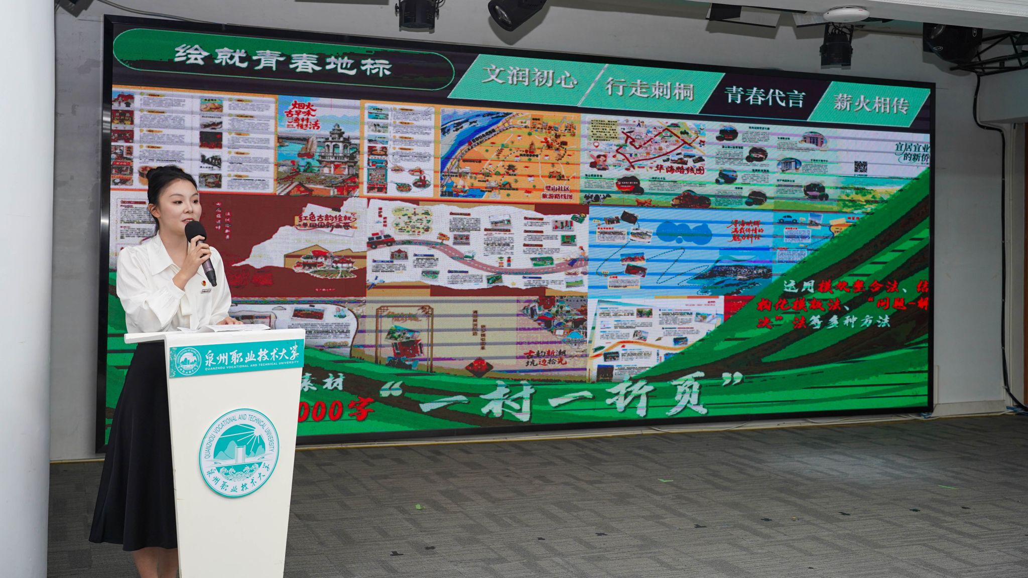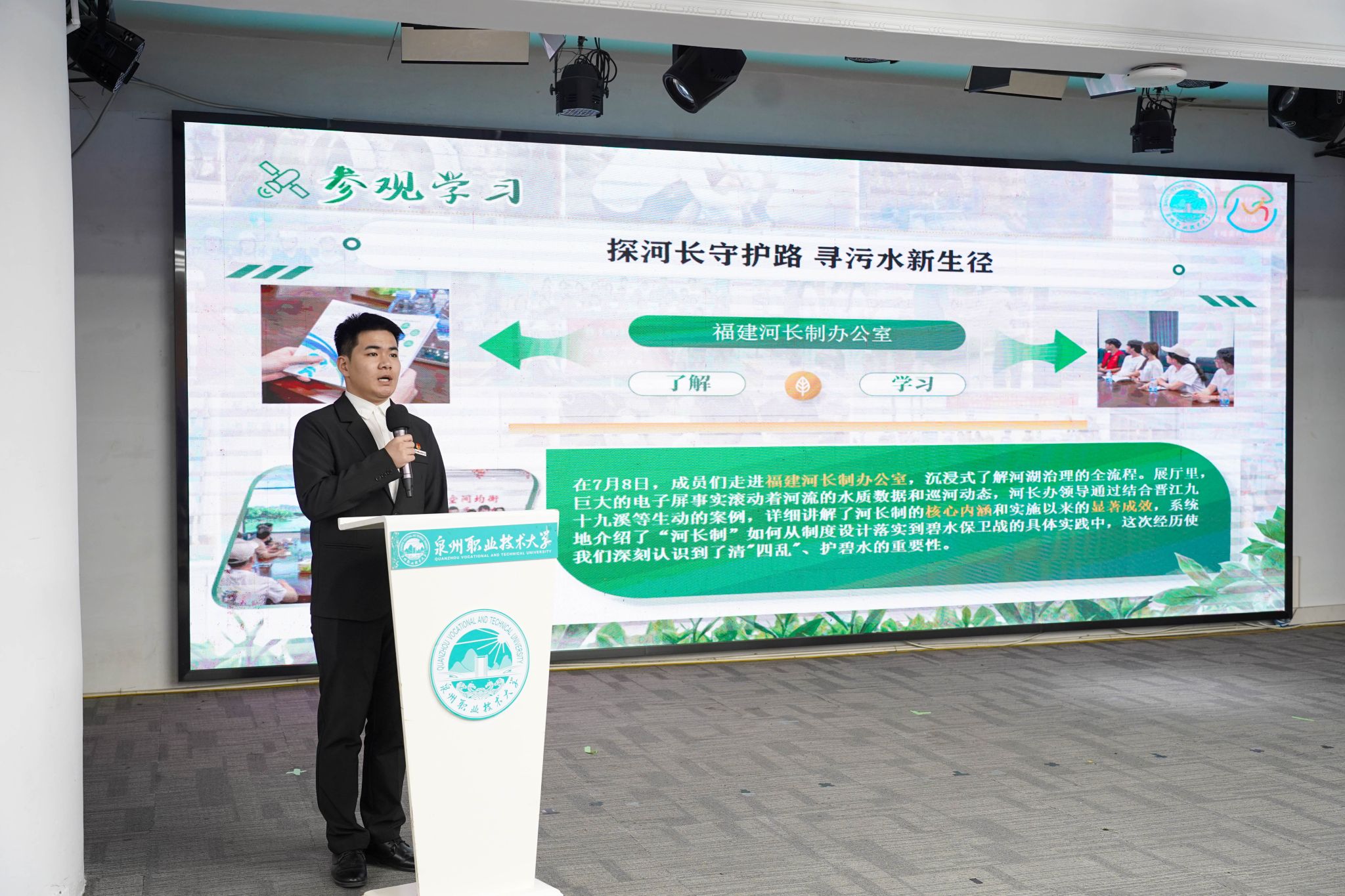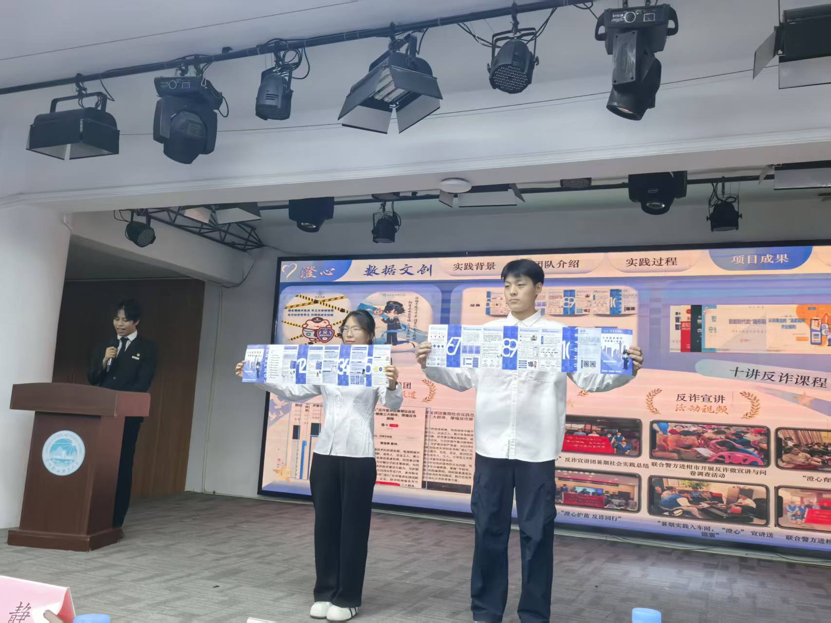 在十佳团队汇报环节,各团队紧扣爱国教育、晋江经验、乡村振兴、反诈宣传、“河小禹”专项等主题,通过PPT讲解、视频展播、实物展示、情景演绎等形式,生动呈现了实践过程、创新做法与扎实成效,展现了泉大青年在实践中“受教育、长才干、作贡献”的青春风采。