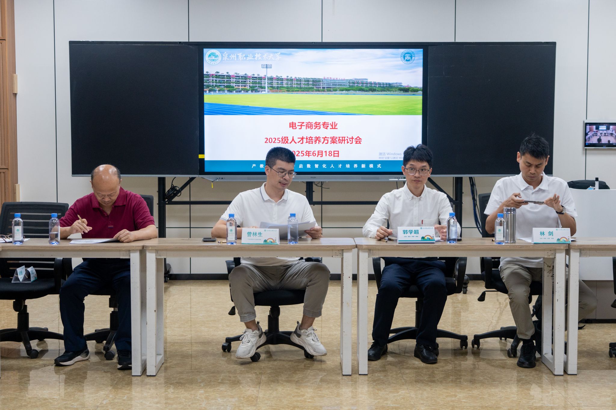 出席活动的嘉宾有华侨大学旅游学院院长助理殷杰、泉州师范学院陈守仁商学院教授林剑、福建晋江华侨职业中专学校教研组长谭建平,企业委员/嘉宾有用友集团新道科技股份有限公司副总裁贾大明、福建陆地港集团有限责任公司副总经理范梦晖、东北证券股份有限公司泉州营业部总经理潘任凭、福建零一智联数字科技有限公司总经理林世斌、加捷财税事务所集团有限公司总经理辛洁晶、晋江美酒慧商贸有限公司总经理黄晓峰、曼巴体育总经理黄国忠、泉州赛成网络科技有限公司总经理张恒等,学校领导副校长张建军、校务顾问来永宝、校长助理/教务处处长苏康敏等,及商学院院长姚宏伟、质量评估处处长李继芳、质量评估处专家孙洪波、教务专家顾问陈强、教务处副处长周燕妮与商学院教师代表。活动由我校商学院党总支书记叶城锋主持。