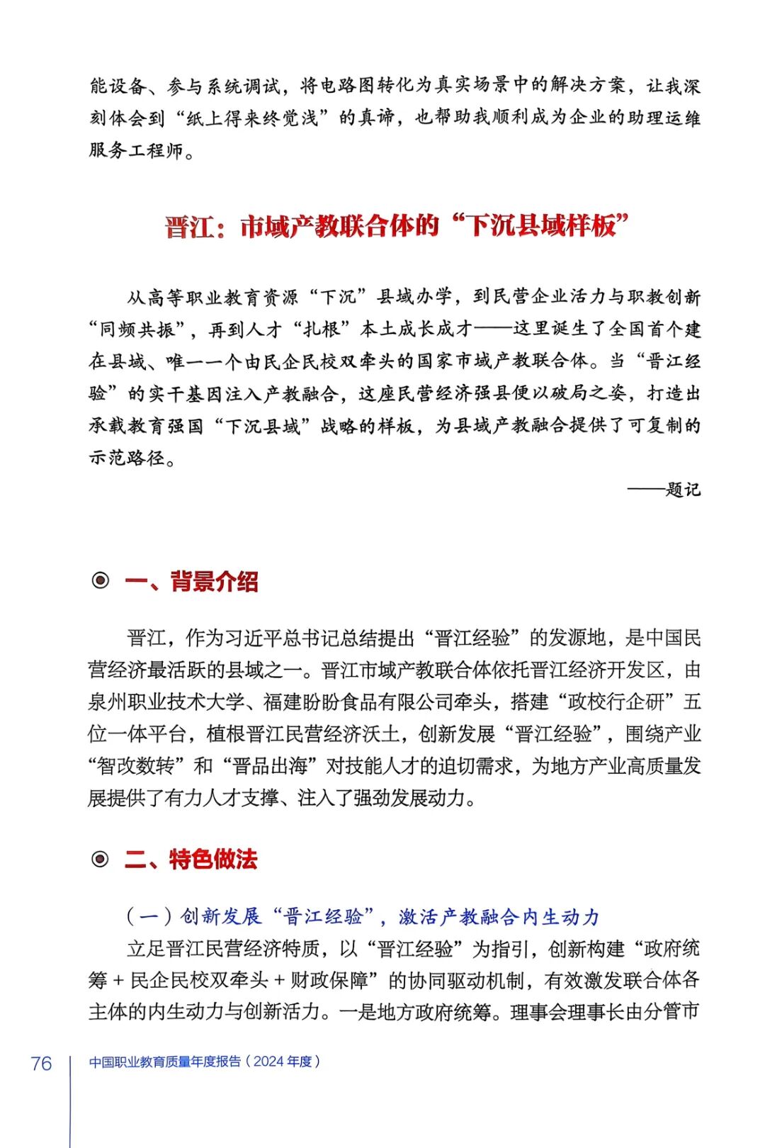 近日,由我校牵头建设的“晋江市域产教联合体”成功入选2024年度《中国职业教育质量年报》典型案例,在“一体两翼的探索与实践”章节中作为示范案例重点呈现。该成果标志着我校在推动职业教育深度融入区域发展、服务县域经济转型升级方面走在了全国前列。
