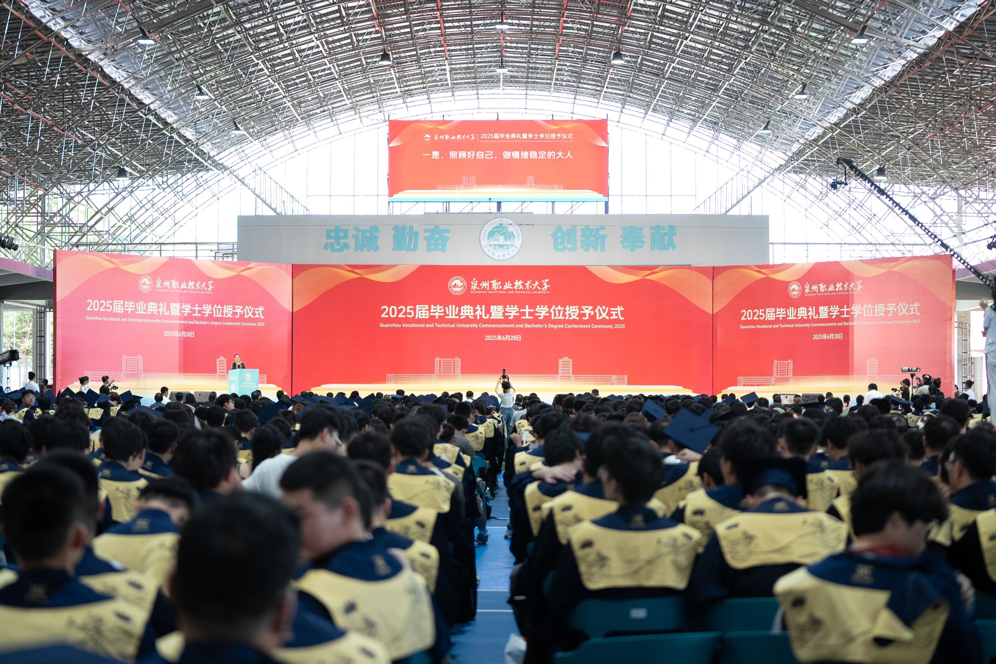又是一年骊歌响起时。今天,我们怀着喜悦与不舍,共同见证这一重要时刻。在此,我谨代表学校向圆满完成学业的全体毕业生表示最热烈的祝贺!向辛勤培育你们的师长、悉心指导你们的企业导师,以及默默支持你们的家人,致以最诚挚的感谢!向长期以来关心支持泉州职业技术大学建设和发展的社会各界朋友致以最由衷的敬意!(掌声)