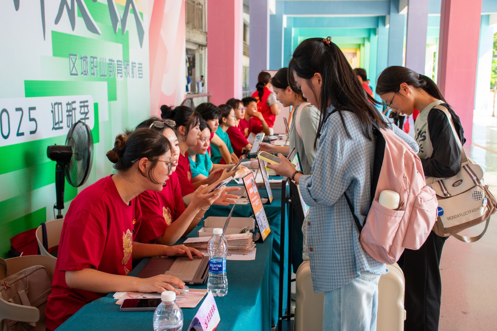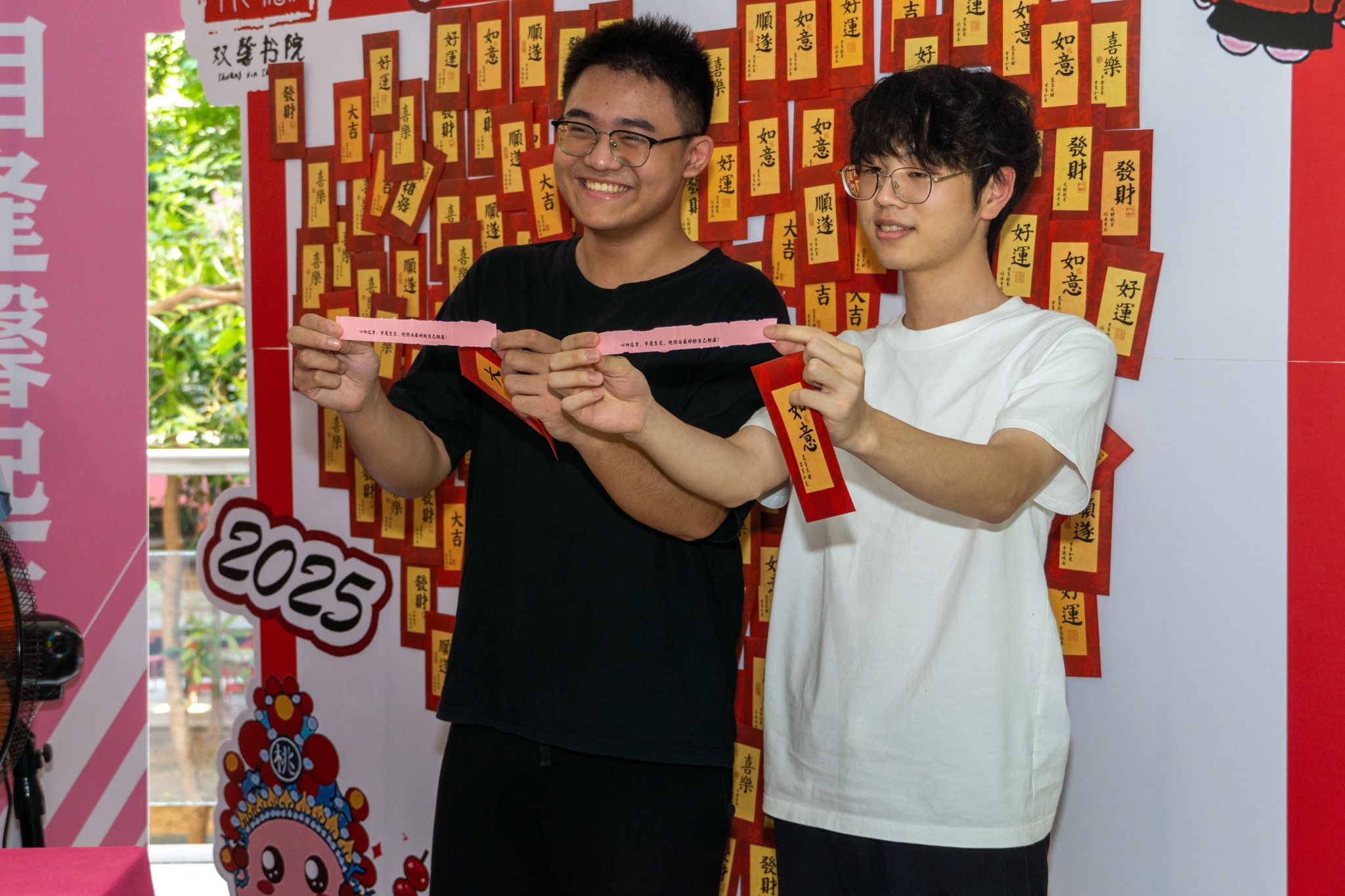走进双馨书院,一大片心形红包墙映入眼帘。每位新生来到书院,都可以在这里抽取一个红包。每个红包里都藏着祝福语,上面分别写着“前程似锦”“好柿发生”“大吉大利”等。抽完红包后,新生们就能兑换祝福书签、钥匙扣等小礼品。