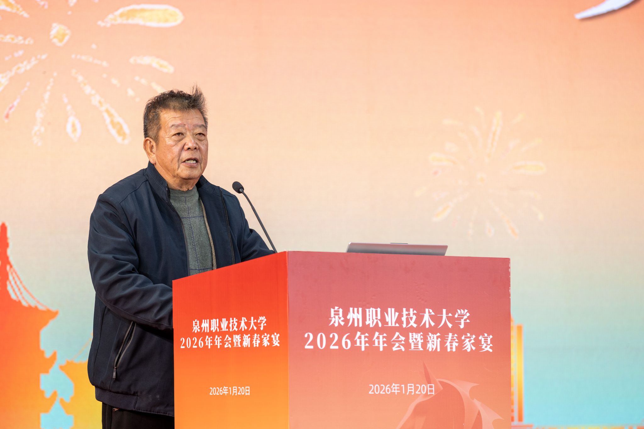 1月20日,泉州职业技术大学隆重举行2026年会。学校创办人、董事长吴金营,泉大教育基金会理事长杨培琛,校长吴滨如,党委书记傅志雄,全体校领导、教职工及产业伙伴代表、南非培训学员参加。年会由傅志雄书记主持。