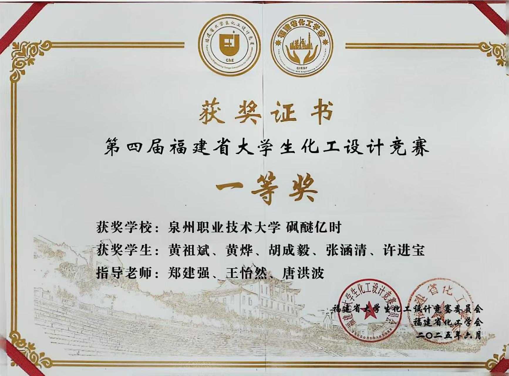 竞赛驱动赋能。构建 “院级-校级-市级-省级-国家级”五级竞赛体系,以各级各类技能竞赛为牵引,为学生搭建全方位、多层次的科创实践平台。在院级层面,举办“小小化学家”实验技术大赛、拆“泵”专家比赛、化工设计大赛、化学实验创新设计大赛等技能竞赛,通过反复竞赛锻炼,磨砺学生的实践创新能力与精益求精的工匠品质。积极组织学生参加中国国际大学生创新大赛、全国大学生化工设计竞赛、全国大学生油气储运工程设计技能大赛、“挑战杯”福建省大学生课外学术科技作品竞赛等赛事,以竞赛驱动学生提升实践创新能力,为学生的职业发展和科研探索奠定坚实基础,在各类学科竞赛和创新创业活动中表现优异,荣获国家级和省级奖项30余项,如第一届全国大学生化工HSE创新设计大赛特等奖、第七届中华职业教育创新创业大赛一等奖、全国大学生油气储运工程设计技能大赛一等奖、中国国际大学生创新大赛(2024)国家铜奖和省赛金奖、第四届福建省大学生化工设计大赛一等奖等。